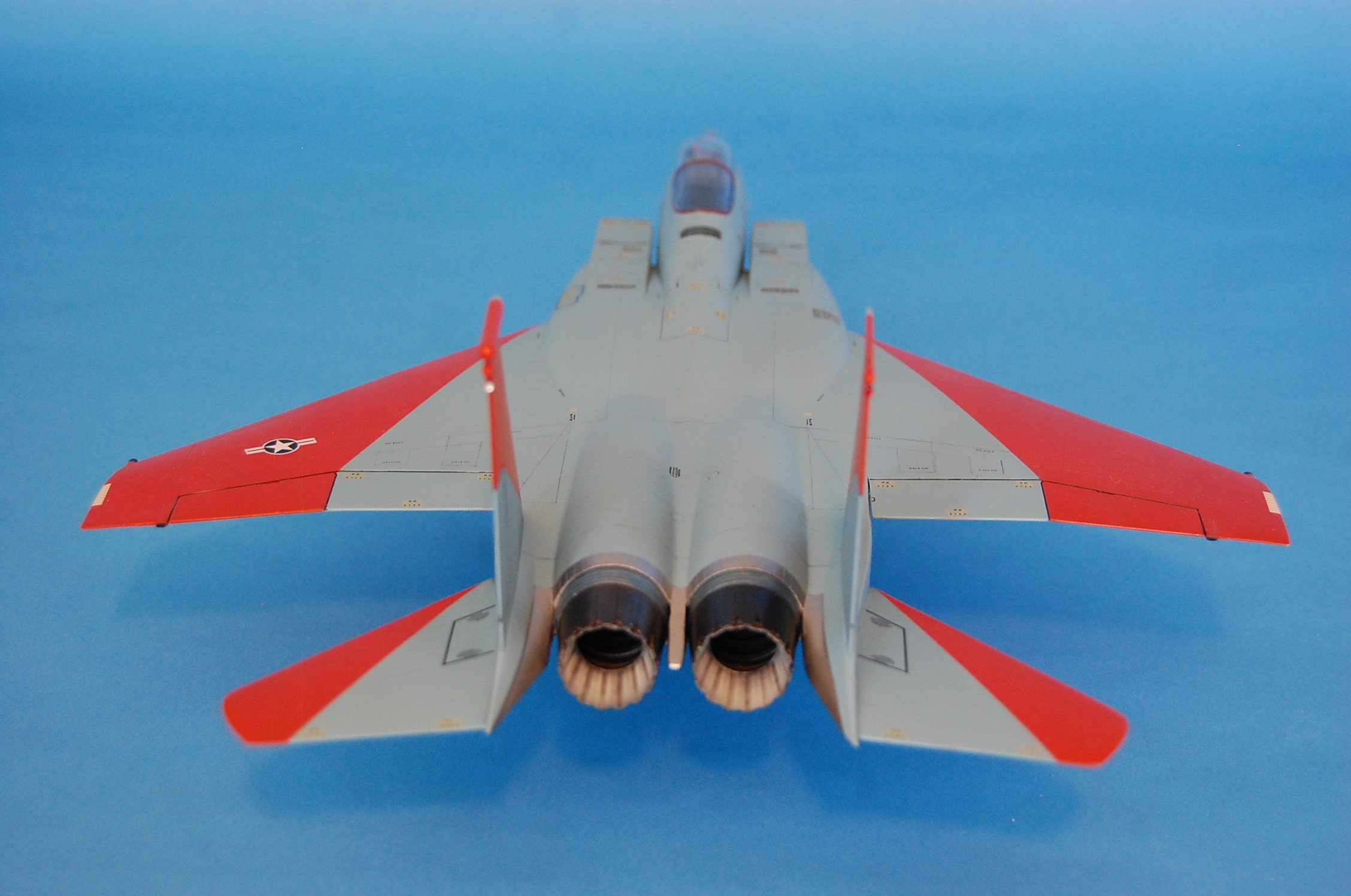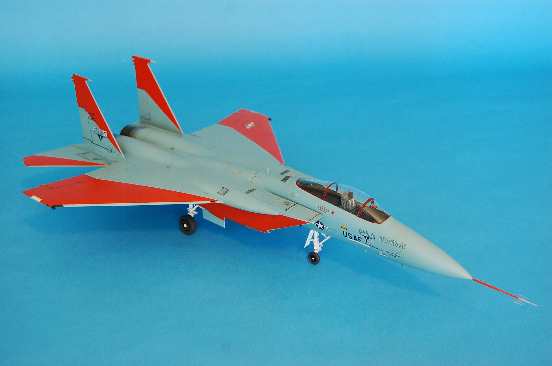 PA28Ace Posted June 27, 2023 Share Posted June 27, 2023 Final assembly: the canopy masks come off, the landing gear, doors, and engines are installed. The very last step was to add a Master test boom for an F-16XL to the end of the brass tube already installed. The F-16XL test boom was the closest thing I could find to simulate the prototype Eagle’s boom. Not a perfect match, but close. Assembly was tedious because there are three microscopic PE AOA and sideslip vanes to glue to it. Once on, 10208, Eagle number one, is complete. What I could have done better: As I already mentioned, I think I could have done something better to stop the old stencil decals from silvering. The orange markings on the intakes and bottom of the fuselage are too big. Caracal’s drawing (which I followed) in the decal set depict them this way, however, looking at old photos, they don’t extend so far back on the fuselage. I ended-up with some white specks in the cockpit area which I’m sure are the result of filling gaps around the canopy and windscreen after they were glued on. Lastly, I ended up with gaps on the bottom of the model between the engine tail feathers and the fuselage. This was even after I had test fitted these things! All of this is hindsight. In general, I’m happy with the model and the general impression is really good. Monogram’s 1970s model, though there are major fit problems, really nails the shape of the airplane. Quote Link to post Share on other sites