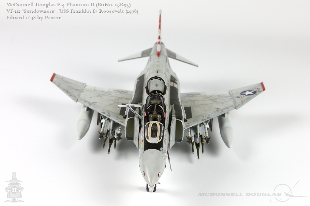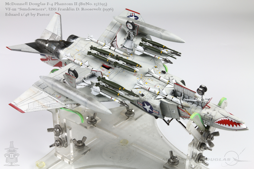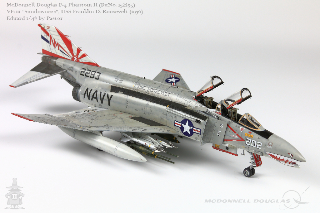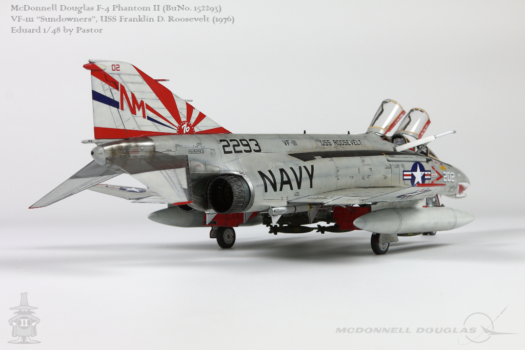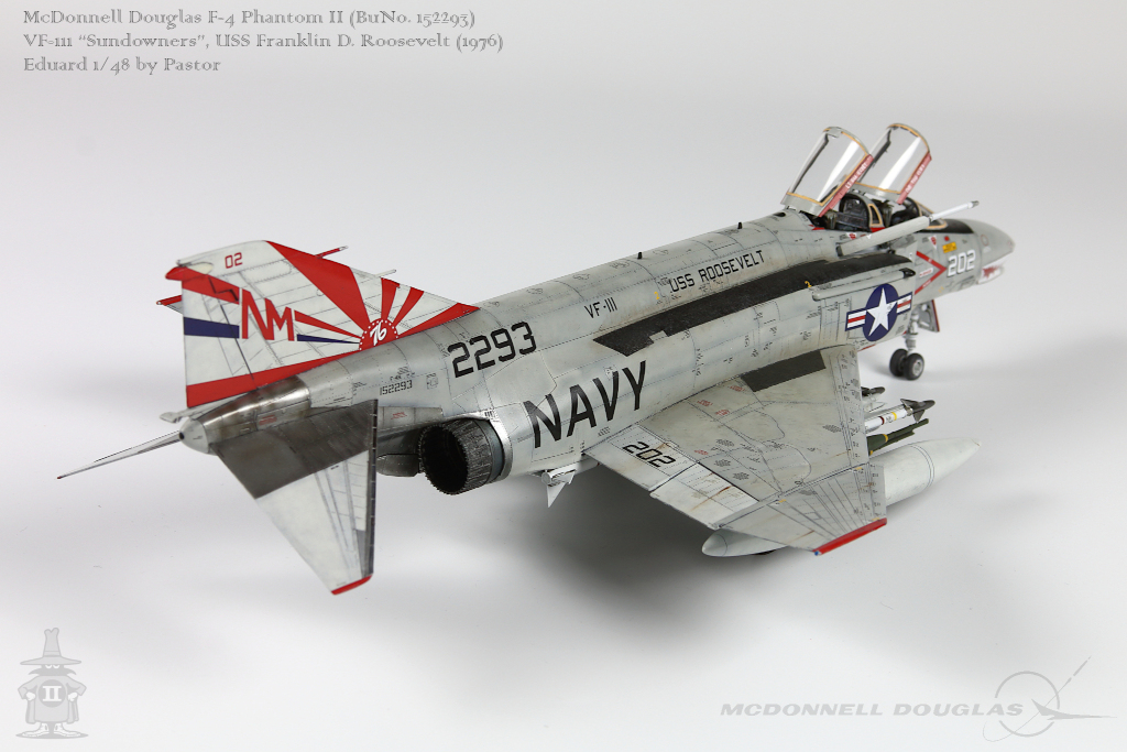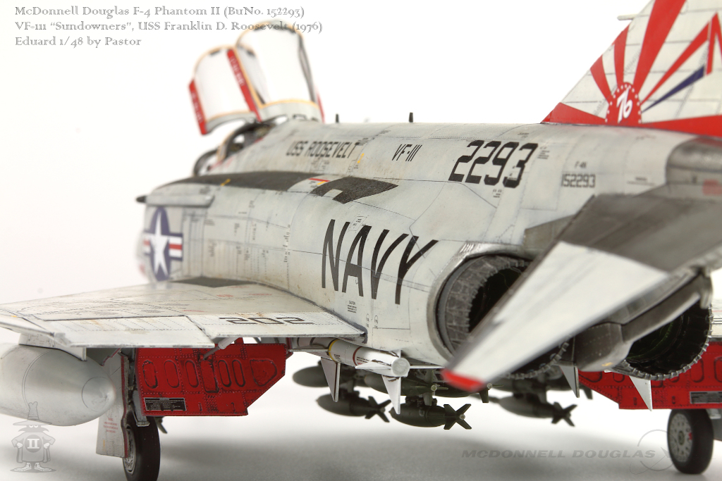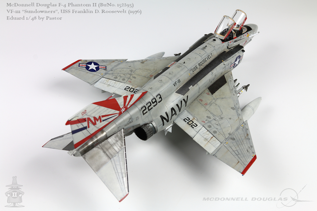 Pastor Posted June 6, 2021 Share Posted June 6, 2021 Hi!, Finally I am able to show my latest finished project: F-4N Phantom from VF-111 Sundowners wearing "Bicentennial" livery. This is Eduard repack of Academy with additions of many resin and photoetched parts. Model is made mostly out of the box. Few additions were: - resin MER and TER's from Eduard - resin Mk81's also from Eduard - decals for AIM9 and AIM7 from Tamiya's F-14A - AoA sensor from Master Model in painted mostly with Hataka Orange-Line lacquers and Tamiya paints. Metalizers are AK Extreme Metal. Washes by Flory + Modellers World Weathering made mostly with AK pencils with little addition of oil paints and Tamiya pigments. Hope you'll enjoy it! Quote Link to post Share on other sites