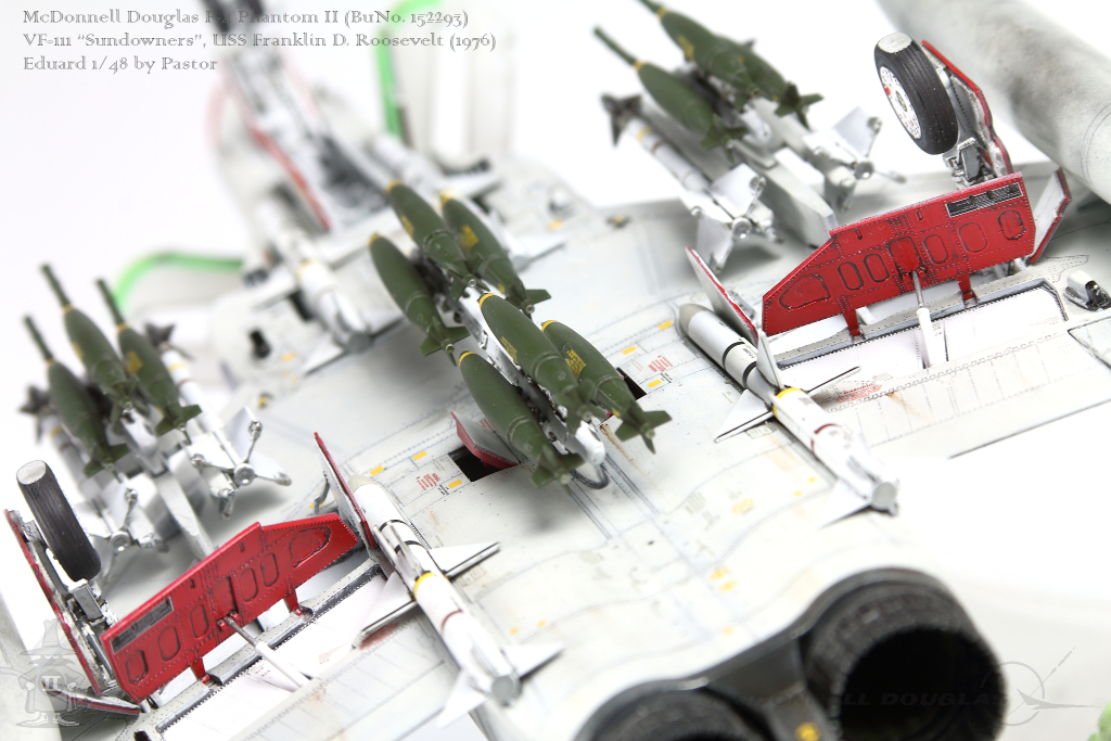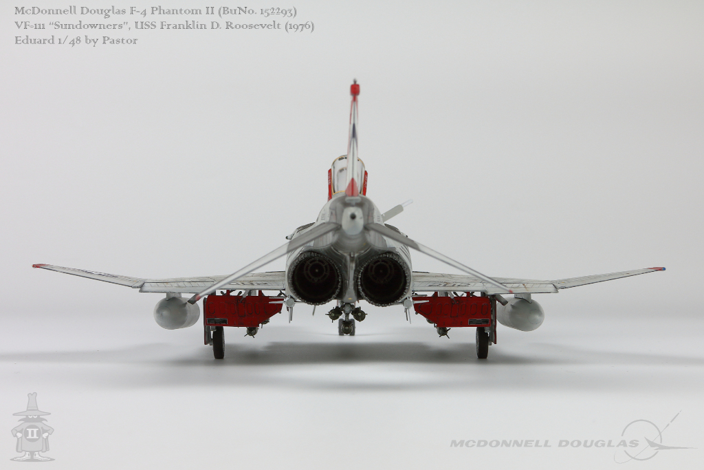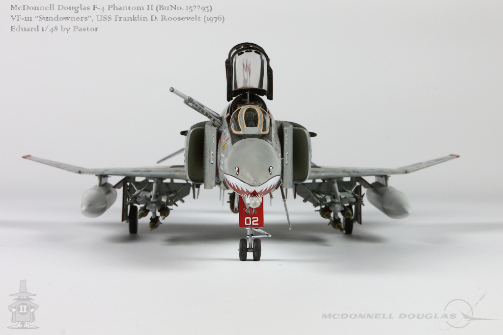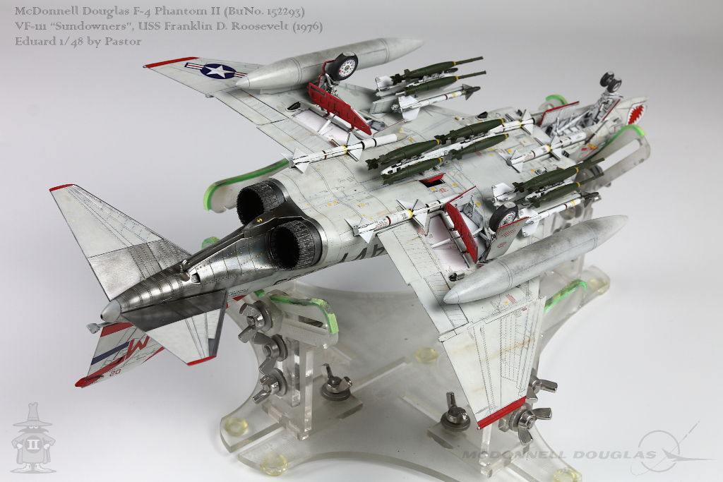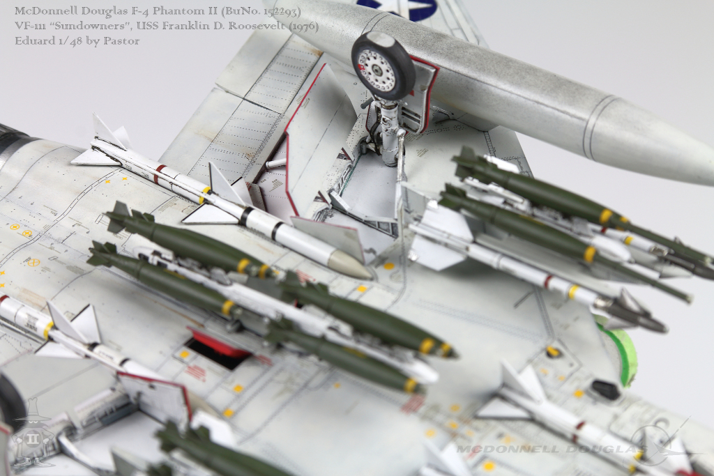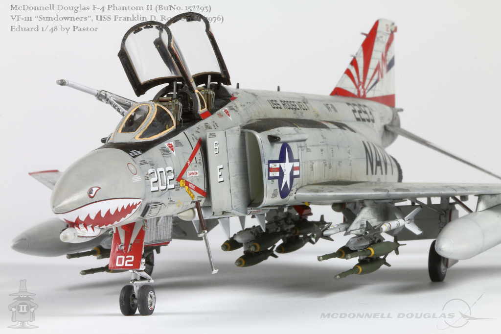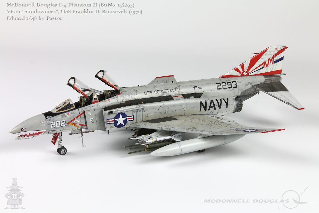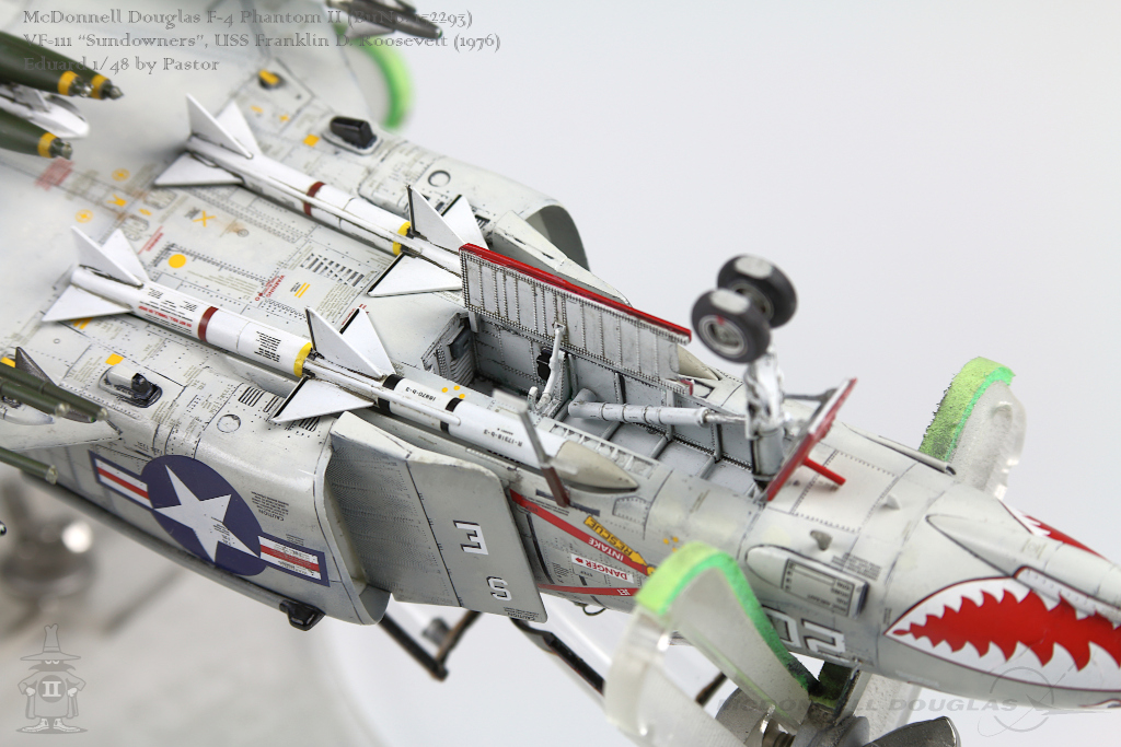 Pastor Posted June 6, 2021 Share Posted June 6, 2021 Hi!, Finally I am able to show my latest finished project: F-4N Phantom from VF-111 Sundowners wearing "Bicentennial" livery. This is Eduard repack of Academy with additions of many resin and photoetched parts. Model is made mostly out of the box. Few additions were: - resin MER and TER's from Eduard - resin Mk81's also from Eduard - decals for AIM9 and AIM7 from Tamiya's F-14A - AoA sensor from Master Model in painted mostly with Hataka Orange-Line lacquers and Tamiya paints. Metalizers are AK Extreme Metal. Washes by Flory + Modellers World Weathering made mostly with AK pencils with little addition of oil paints and Tamiya pigments. Hope you'll enjoy it! Quote Link to post Share on other sites