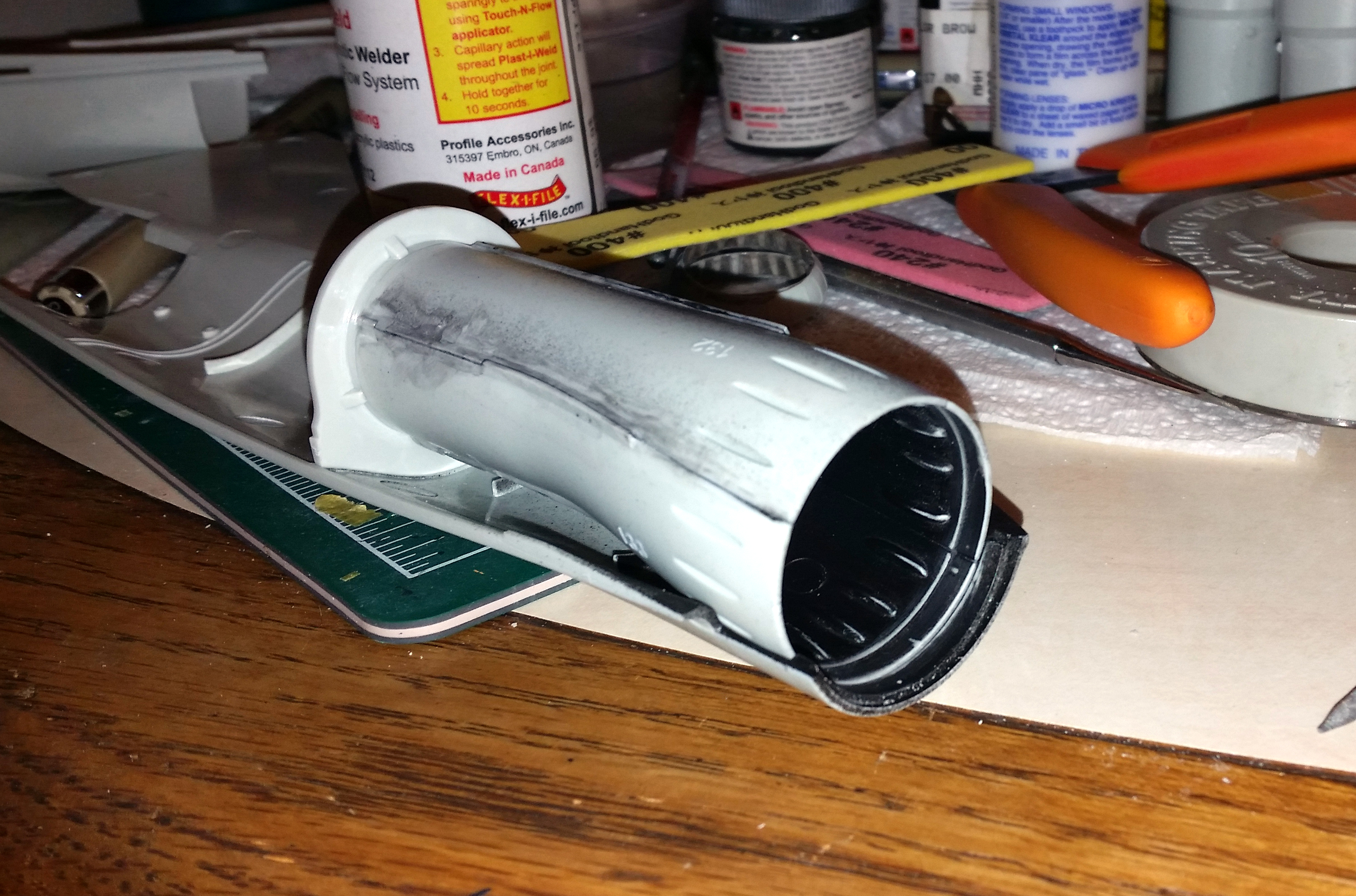 Jay Chladek Posted February 12, 2022 Author Share Posted February 12, 2022 Work continues to progress, albeit slowly. Not due to any fault in the kit, just my speed is all as I want to get this done right. In any event I have the engine nacelles built and primered. Before adding the exhausts to the nacelles, I gave them a shot of black primer outside in case they were visible inside the open bypass doors. I also did the same with the insides of the bypass door rings to make sure no bare plastic would be visible inside the back end either. Before installation I did shoot the outside with black primer to make sure my filling and sanding of the doors was done properly because they had a lot of sink marks. Not all kits have the sink mark problem, but it can happen so it is best to be prepared for it. When done this is what I had. The strip styrene I used filled the transition area from the doors to the nacelle body nicely from top to bottom. The black lines on top are guide marks to help me know where the panel lines are when I fill and sand. The fit of the three pieces that make up the nacelle bodies and outer wings are pretty good, but there are steps up top that require a bit of work to address. Next time I build one, I may sand the insides of the interlocking tabs to help the parts fit more flush on the outside. The insides of the exhaust channels and the nozzles were painted and the nozzles have been temporarily tacked on. I used a combination of Tamiya Gunmetal (for the forward part of the channels) and Light Gunmetal for the nozzle petals. Looking up the exhausts, they seem to look the part nicely. Here you can see the intakes with the spike cones pulled. By building up the intakes the way I did and not gluing the spikes in, I can address the seams on the intake lip. I know, one could paint a lighter shade of metallic in these areas as the instructions suggest, but just go straight black as trust me, you won't be able to see much in there anyway. I gave the intake throats some more black Mr. Surfacer and sanded them down in spots to disguise any serious seams which "might" be visible when the spikes are installed. And here are the mostly complete nacelles after a going over with Mr Black Surfacer 1500. No they are not done. But what better primer and scratch filler to use than a black one for a black jet. I'm going to work on the fuselage for awhile before finishing these up in preparation for the final assembly. BTW, when you do your paint work, it is not a bad idea to stick in a tube or some paper rolled into a tube into each exhaust to help prevent any black overspray from getting in through the bypass doors and possibly screwing up the paint work on the inside. Quote Link to post Share on other sites