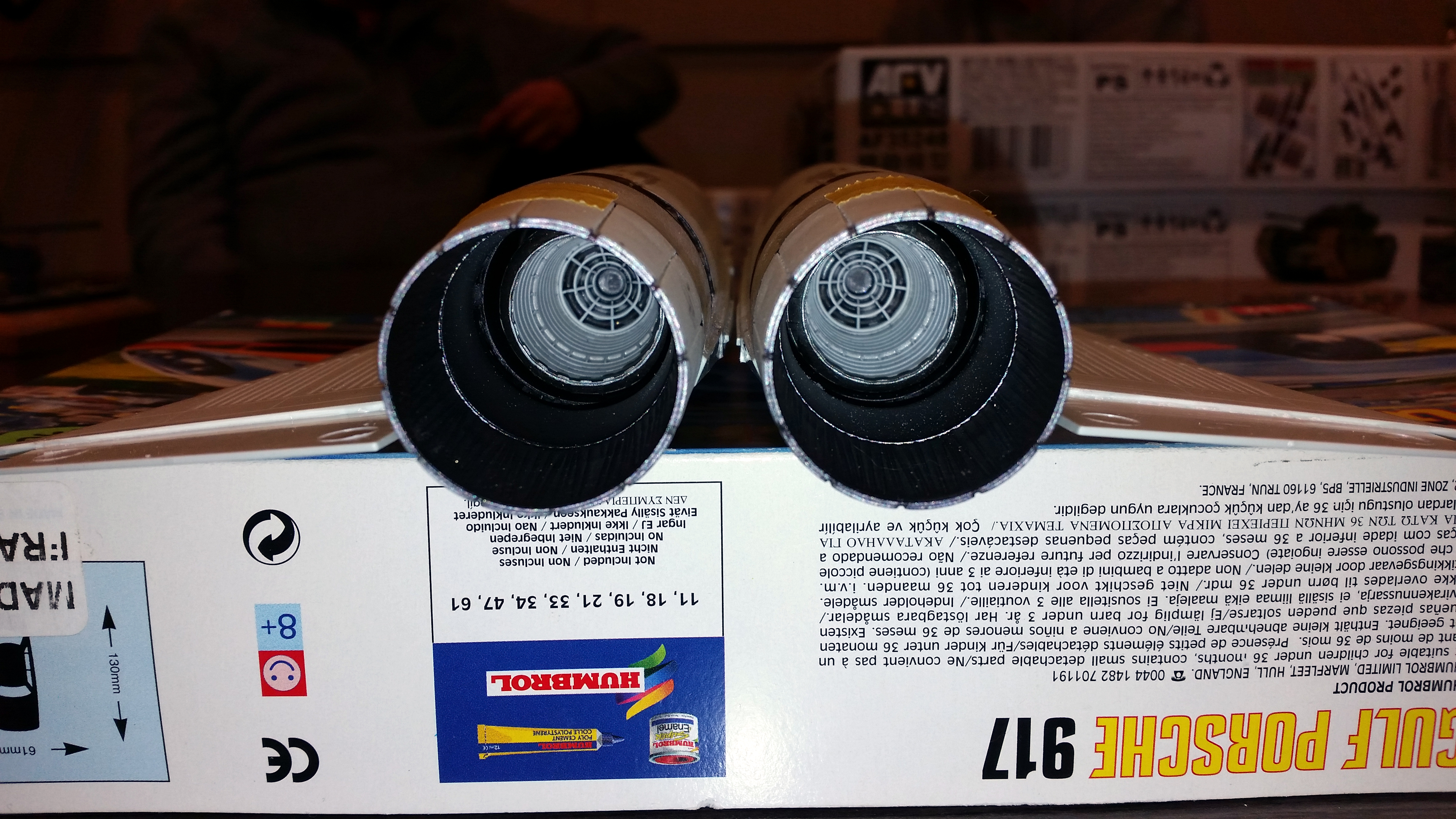 Jay Chladek Posted January 25, 2022 Author Share Posted January 25, 2022 Next I moved to the engine exhausts. The flame holder area of the J58 engines is rather large and hollow, plus it takes up about a third of the length of the engine itself. To help simplify construction of this area and help prevent an exposed seam that would need to be dealt with on the inside, Revell molded the flame buckets as one piece tubes with a slight taper to them which gives them a forced perspective. The rings of the flame holders are molded as a separate piece which glues on at the front. The exhaust nozzle at the rear is also molded separately. You get four of these assemblies in the Revell of Germany kit since they also are used in the exposed J58 engines intended for the display stand. The Revell USA kit will only have two. I spent a lot of time at the SAC museum looking at the J58 engine from 61-7964 which we have on display and I wanted to try and duplicate the colorings inside the flame buckets properly. To start with, I airbrushed the insides of the flame buckets and flame holders with Tamiya LP-35 Insignia White. Any brand of off white can work. Then I gloss coated them in preparation for wash application. On the flame holder rings, I used Tamiya black enamel wash to represent the deep recesses. In a couple spots I had to touch up areas with a black pen though. For the flame bucket housing, I mixed up a diluted mixture of Tamiya smoke tint wash to get the slight staining I was after. For the nozzle section, I painted those parts in LP-35 for the raised petals, and Tamiya gray metallic for the recessed parts and the outside. Then to give everything a little wear and tear, I gave the insides of the nozzle a Tamiya brown enamel wash to represent the slightly brown soot discoloration. The results may not be exact, but I was happy with my efforts. You can see a little discoloration of these nozzle petals, although when they were pulled out of the jet after its flight in 1990, they were a bit darker and browner. So I believe World Wide Aircraft Recovery cleaned them up a little before the engine was put on display at the museum. This picture of a picture displayed on a wall at the museum shows an engine being dismounted before the aircraft was trucked over the road 30 miles from Bellevue to Ashland on its landing gear. You can see how discolored the nozzle area itself looks while the flame bucket looks a lot brighter in color. Quote Link to post Share on other sites