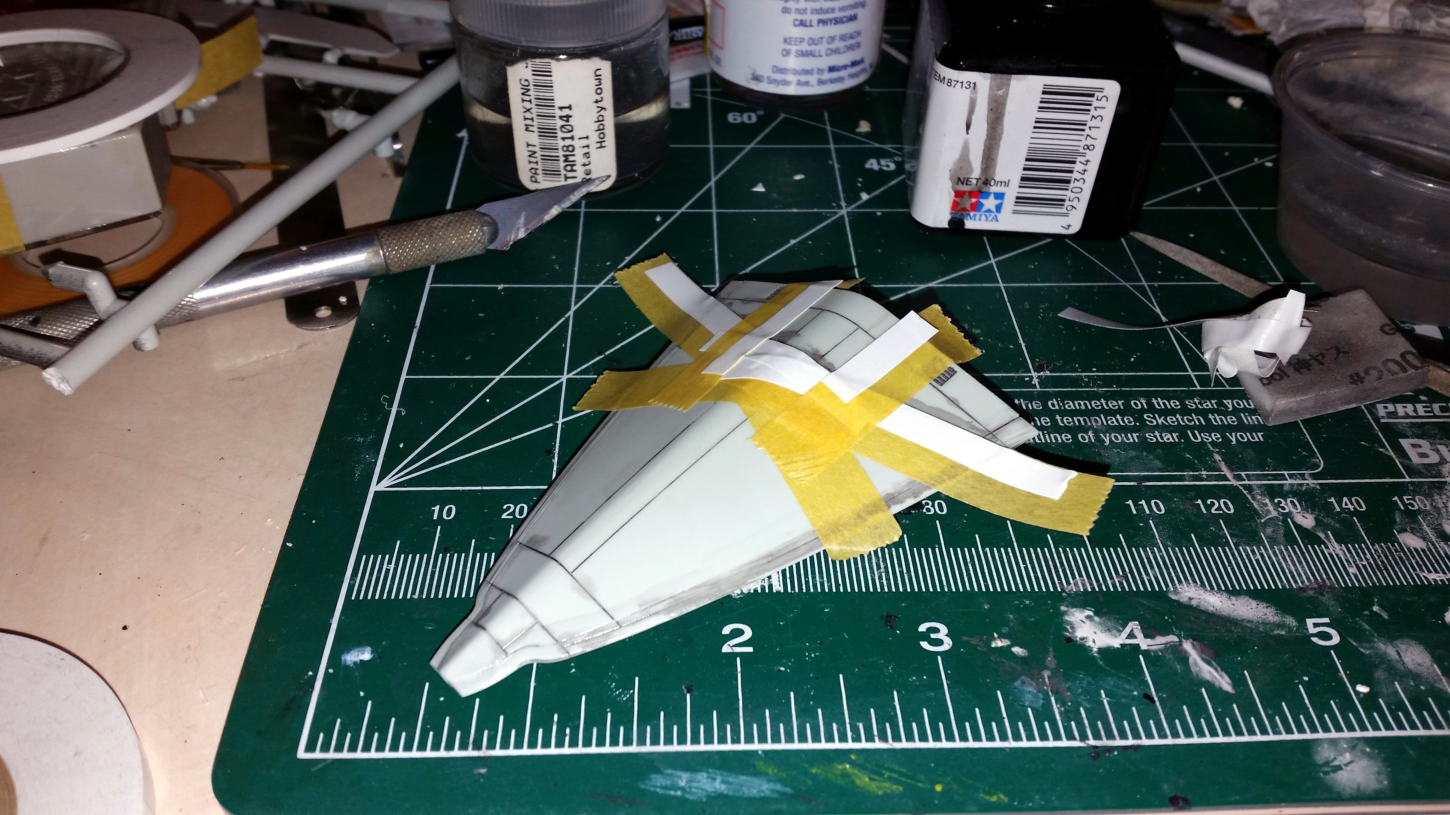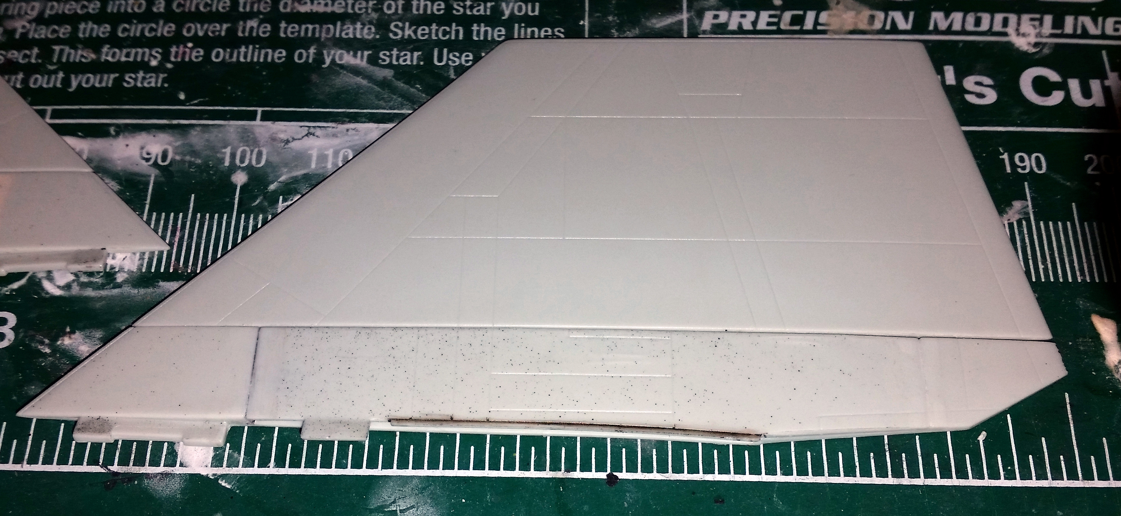 Jay Chladek Posted August 7, 2022 Author Share Posted August 7, 2022 (edited) I discovered an error on the kit during construction of the tails. There is some excess plastic on the bottom of the right inner tail that should not be there. The problem isn't present on the left tail and if left there, you end up with a big gap visible on the right outer tail where it slots into the engine pod. These pictures illustrate the problem. First we have the left tail: And then we have the stock right tail (both viewed from the inside) I have accented the spot with a black wash after scribing in where I needed to scribe in a separation line to remove it. Here is the issue in closeup form. The fix is very easy to do. In my case, I used white Tamiya tape to act as a scribing guide and then scribed in a line and accented it with a black wash. Then I just continued scribing deeper and deeper until I cut the excess plastic off. The result is the left and right tail root edges both match and they slot into the engine pods perfectly with no unsightly gaps. Edited August 7, 2022 by Jay Chladek Quote Link to post Share on other sites