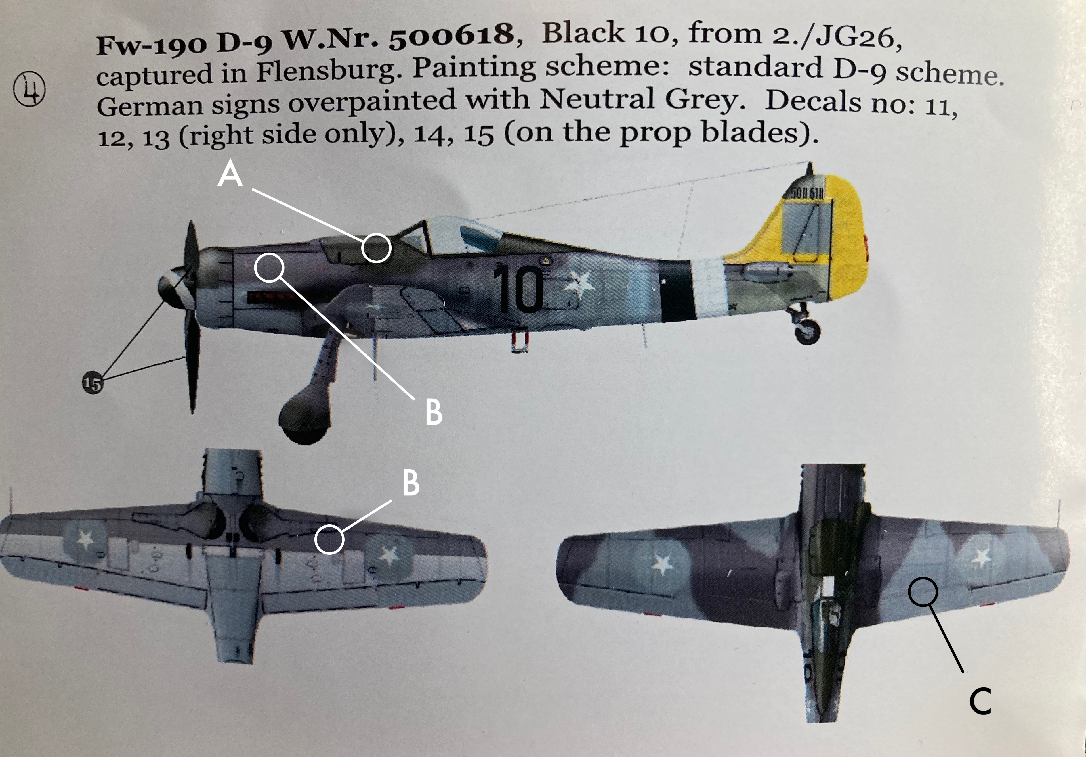 Anders_Isaksson Posted August 21, 2022 Share Posted August 21, 2022 (edited) This camouflage scheme as stated by Karaya for their decal set makes no sense, but maybe that’s just me. - A is probably a green like either RLM 81 or 82. (Assuming that RLM 83 actually is more of a blue…) - B is RLM 75? But why on the forward underside of the wing? - C should also be a green like either RLM 81 or 82? Certainly not RLM 76 like the instruction implicates. Any thoughts? Edited August 21, 2022 by Anders_Isaksson Quote Link to post Share on other sites