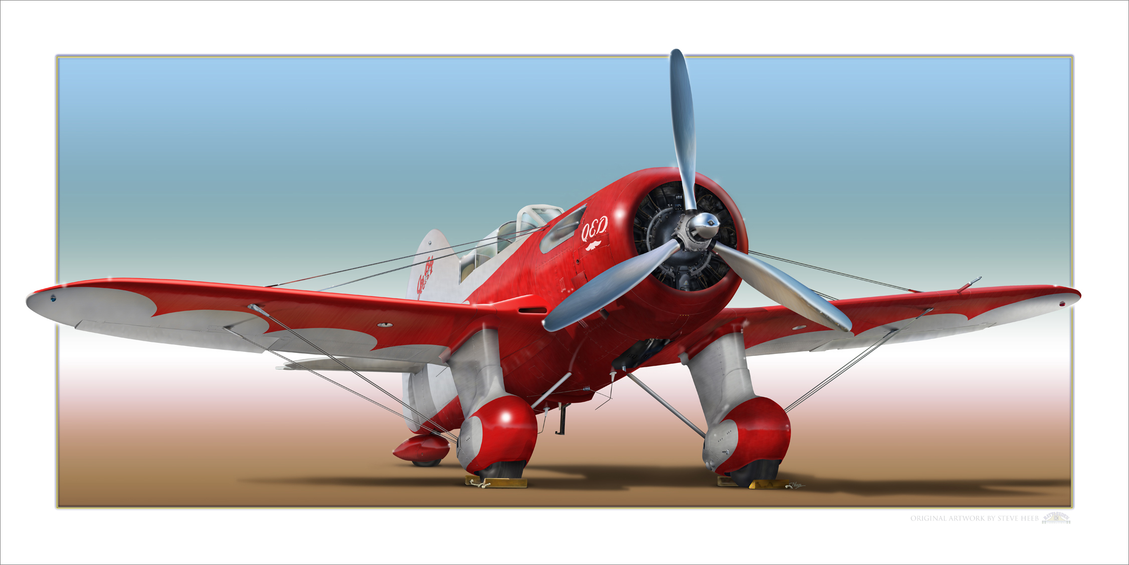 Ol' Scrapiron Posted September 3, 2022 Share Posted September 3, 2022 (edited) Inspiration for this 2019 project was the GeeBee replica built as the QED II by a local aviator, its completion just months before he lost his battle with cancer. The beautiful plane was awarded recognition during its debut at OshKosh and I had the opportunity to photograph it during an airshow at nearby Paine Field. The digital painting was created at 500ppi to be output as giclee prints to fit 10x20-inch frame. Some personal points of interest include the polished propellers and radial engine, massive struts on the main landing gear, colorful scheme and the rigging. Here are a few cropped areas that show the level of detail a little better. - - - - - - One of my favorite projects, in part because I needed to come up with techniques to overcome challenges that would be very helpful in future projects. Edited October 20, 2022 by Ol' Scrapiron Quote Link to post Share on other sites