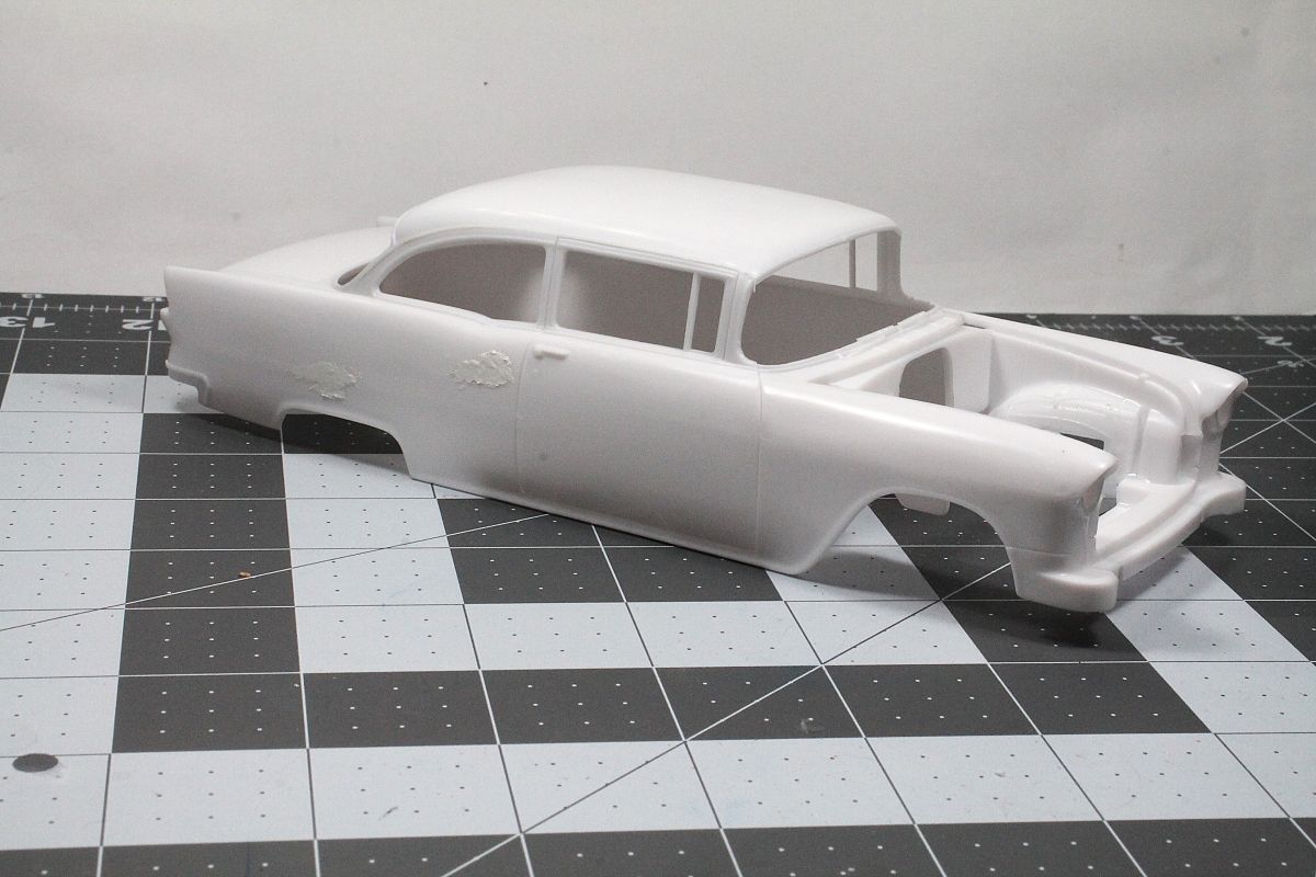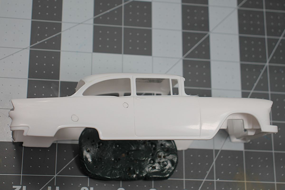 jonwinn Posted November 16, 2022 Author Share Posted November 16, 2022 I have a start on this. I sanded the Bel Air molding off the body and added the hood scoop. I am going to make a Chevrolet model 150 Utility Sedan converted into a street rod. Chevrolet had 3 models in '55, the basic model 150 bare bones car, the model 210 with ash trays and rugs, then the Bel Air which was called the "mini Cadillac" with a lot of "bells and whistles". I am using the kit 265 cu. in. small block V8 with the crossover exhaust as I do not want to attempt to sand the molded in single exhaust off the chassis. Here is where I am at, engine done and body ready for a first coat of paint. Quote Link to post Share on other sites
