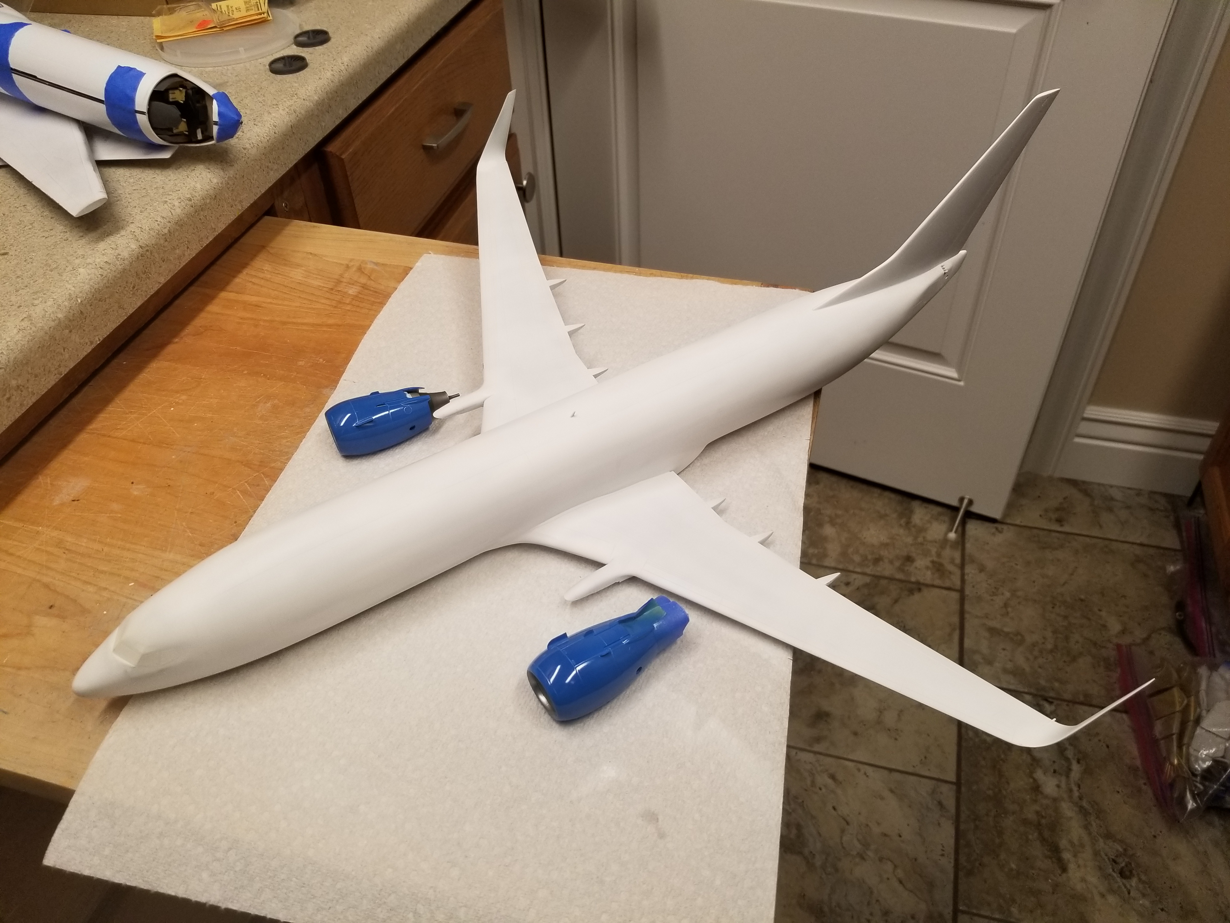 f5guy Posted December 9, 2023 Author Share Posted December 9, 2023 Hi everyone, I made a little more progress on the 737 over the last few days. I got the entire airframe primed with Mr. Surfacer 1500 White, which did a fantastic job. I am quite impressed with this stuff! However, my joy was short lived as those *%#!ing window strips continue to cause problems. I found several more problem spots that will need filling and sanding AGAIN (seventh time now). Hopefully this time does the trick. The next time I build another one of these, I will try something different to get those window strips in , as my usual superglue method clearly didn't do the job. In the next day or two I'll get some sanding done, and maybe, just maybe, start putting some paint down on this guy. Some of you may have noticed that I primed right over the wing tip and wing root lights. I will lightly sand the primer off of those spots and mask them just before shooting the wings Boeing Gray. The leading edges are chrome anyway. I also got the engines primed and painted Model Master "Grabber Blue" . Before painting them however, I added three vanes to each engine. The kit supplies them as photo etch parts. I am not a fan of p/e so I fabricated my own out of thin sheet plastic and glued them on with liquid cement. My Titan Models 72nd 757-200 lurks in the upper left corner of the pic. Is anyone interested in a build thread of that kit? All for now. Fred. Quote Link to post Share on other sites