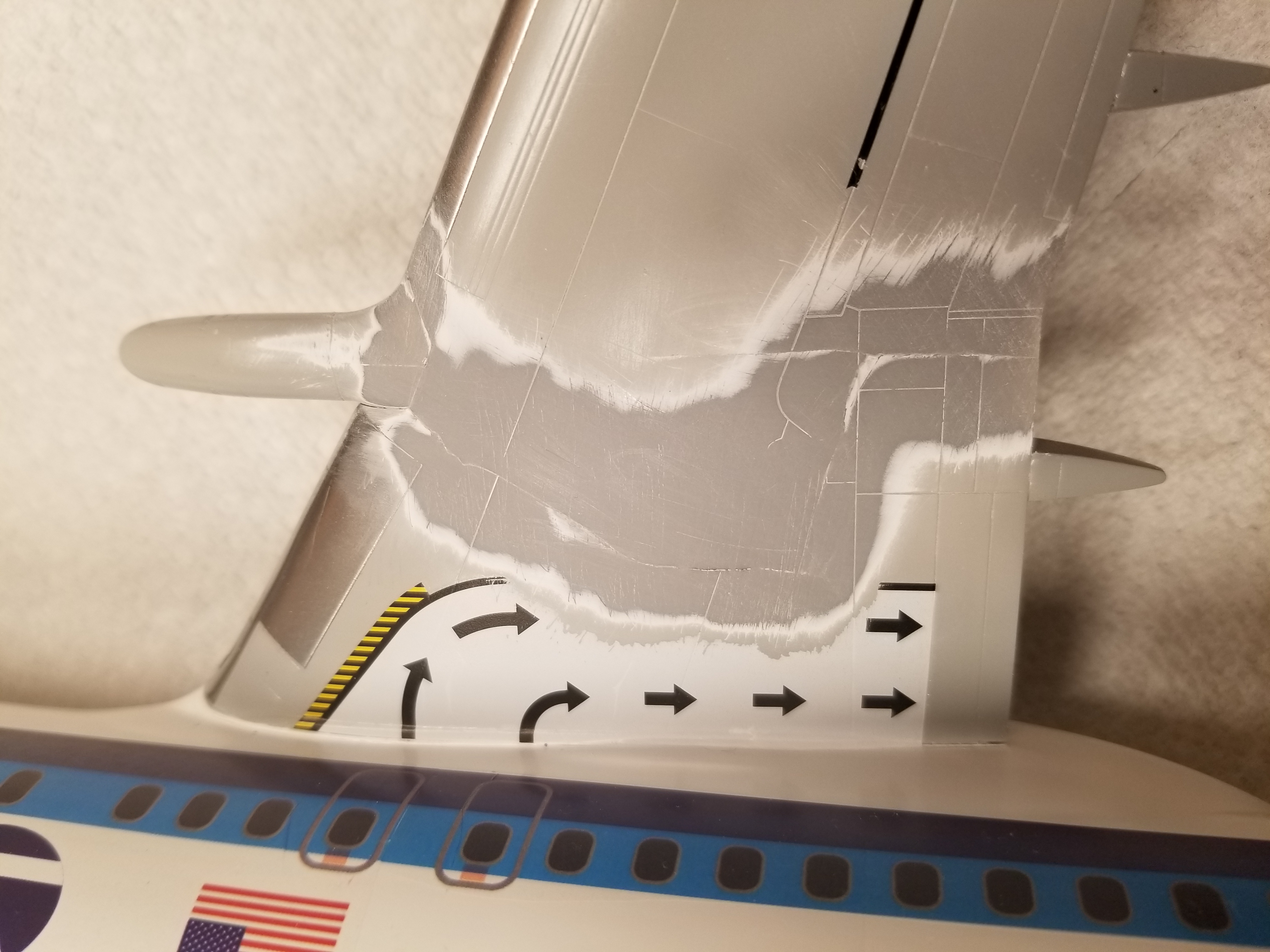 f5guy Posted February 1, 2024 Author Share Posted February 1, 2024 Hi everyone, Well it's been awhile since I last worked on this build, but now it's getting towards the finish line! After months of back and forth between sanding, priming, and attempts at painting, I finally found a system that has given me satisfactory results. Basically I decided to give spraying Tamiya white or Mr Surfacer white through my airbrush a go. I'd read about it for years, but never tried it. What a difference it made after a light sanding! I used Tamiya laquer white for the white area's, MRP Boeing Gray for the wings, and Model Master chrome for the leading edges. After much touch up, I finally got things to where I wanted them. Next up is getting ready for the decals. I was unsure as to the best method to place start placing decals, so I used a method suggested by several folks over at airlinercafe.com (Thank you gentlemen!) . I copied the decal sheet, then cut out the large and long decals. Then I put strips of tape on the non printed side and pasted them on the model to help me judge which decal I should start with to help those long stripes line up correctly. Still it will be a challenge, and no doubt I'll be on here later boo hooing about having to try to match paint to the decals to cover gaps 🤣 See the pic below. I will be attempting the decals this weekend. Thanks for staying with me through this drawn out thread! Fred. Quote Link to post Share on other sites