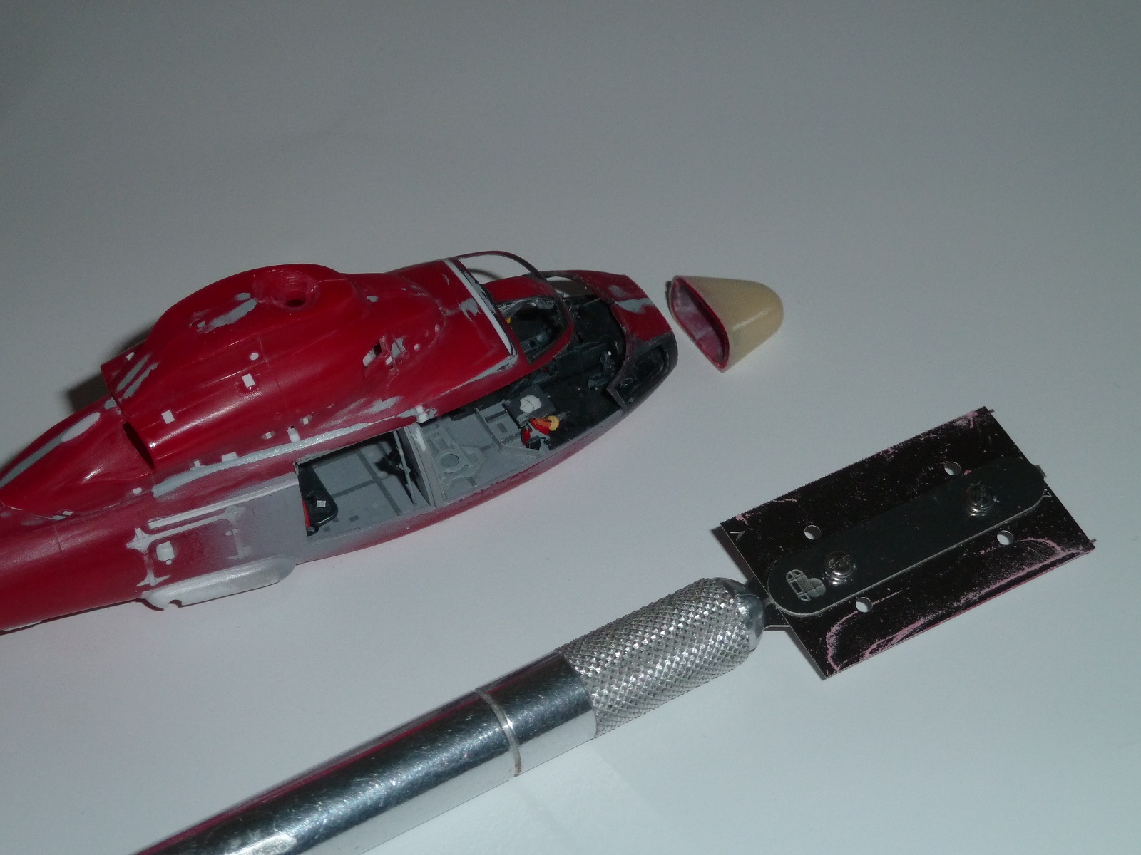 colargol Posted May 21, 2023 Author Share Posted May 21, 2023 Then I focus on the engine fairing. The upper part of the cockpit will be connected to is. I made several light modification to this pieces In the meantime, Dreammodel has produced a Dauphin version of the Helicopter and I will use some part of this kit. I have put the intermediate wall in place to begin the door installation For the middle doors, I am using the pieces of the kit, with some modification (to represent the NACA type air intake in the middle of the door) The engine fairing is in place ... as well as the doors (not glued at that time) For the nose radome, I had trouble ... indeed, it seems to me that the Duarte resin kit piece is not perfectly adapted to the kit : the fuselage would be too long. Moreover, there is a step between the pieces. After a long thinking, I have decided to glue the radome on the kit using Kristal Klear glue, then to saw the nose, to correct the length of the fuselage. And in the end to glue the nose (later) Then I have worked on the belly of the Panther (to make it purr) Quote Link to post Share on other sites