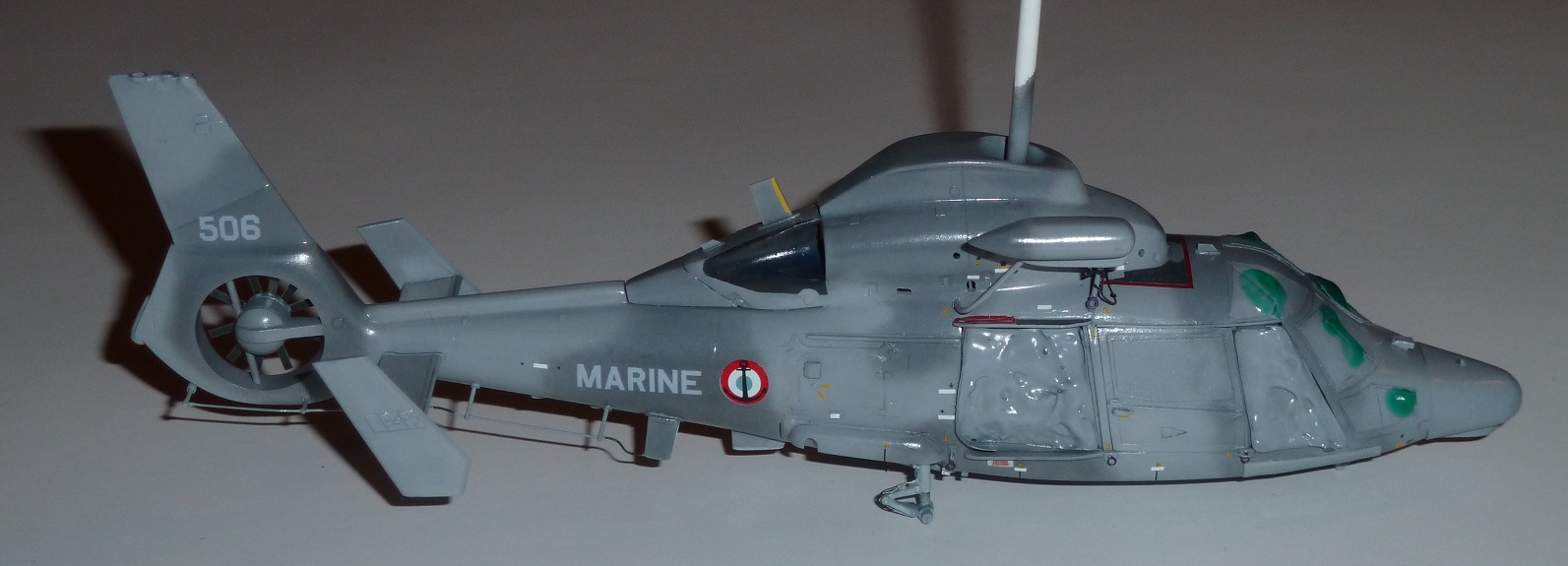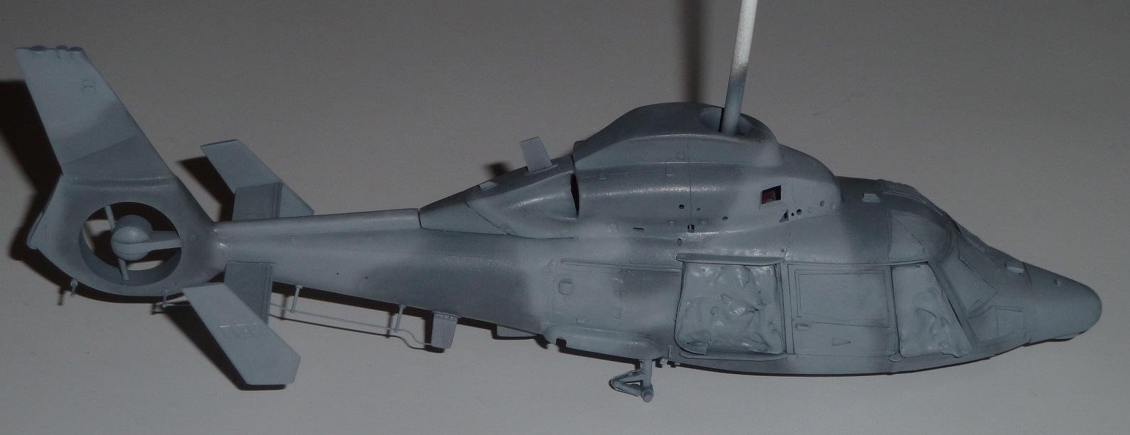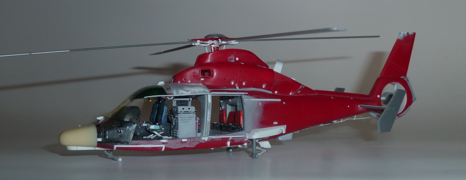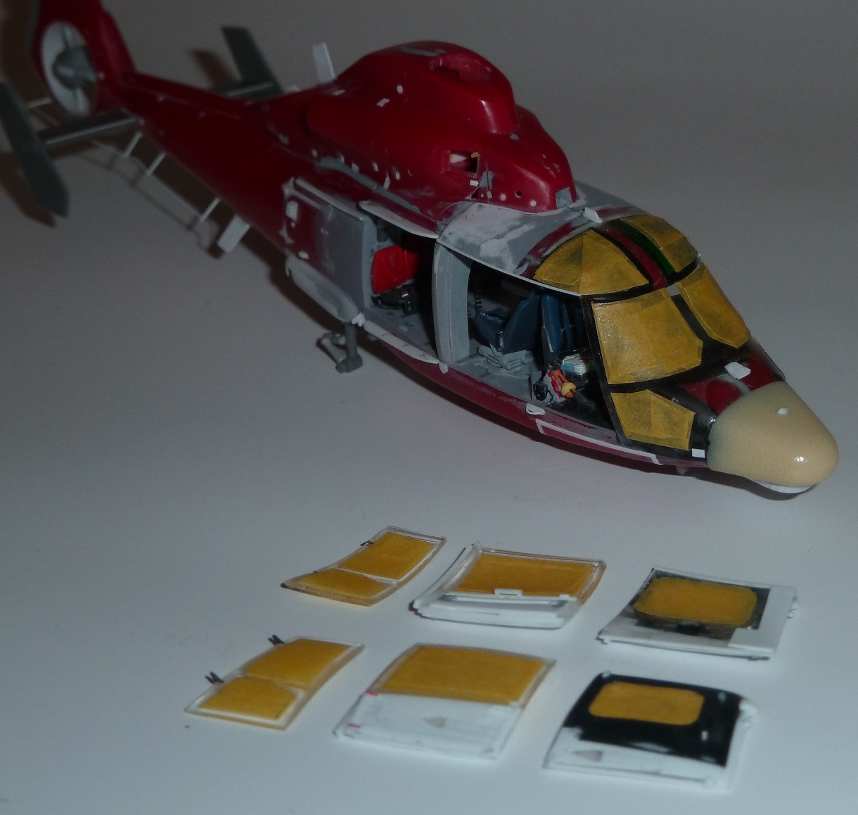 colargol Posted May 21, 2023 Author Share Posted May 21, 2023 The winch is entirely scratchbuild, using photos references The FLIR device is coming from a NH90 Revell kit (same equipment on both helicopter) For the landing gear, I have used the Dreammodel kit, even if it turns out that cyano glue has difficulties for work on it ... The shape of the rear door is totally different between the Dauphin and the Panther. I had to rebuild it. But through the clear part, it will be possible to see the plastic structure. So I decided to use black styrene sheet (from Evergreen). As the door will be opened, The interior structure (especially for the rear part of the doors) would not be seen. Doors in place (not glued) This is the painted cockpit The windshield (I made several, to keep the better one). The small step due to the rhodoid is compensated using a 0.13 mm Evergreen sheet on the top of the cabine. The horizontal tail is from Dreammodel. Radome in place ! It looks like a Panther now ! to be continued ... Quote Link to post Share on other sites