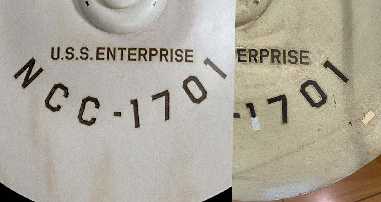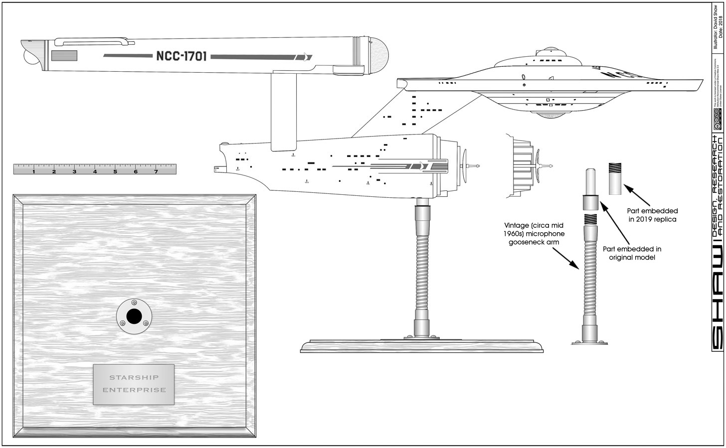 Shaw Posted December 25, 2023 Author Share Posted December 25, 2023 Thanks guys! On 12/20/2023 at 9:47 AM, Scott Smith said: Somewhere I think I have a short mic gooseneck like that. I know I have two longer ones I use as stands to paint models. Thinking about replicating my 1/350 kit with the same base. So, full disclosure, I've never seen a 1/350 model in person. I have seen the boxed kit at a hobby shop, and I assume that the completed model weighs about the same or less. I bring this up because my model is pretty heavy, and the gooseneck arm has a hard time supporting the weight. I had put a thin (quarter inch diameter) wood rod inside the arm to help re-enforce it, but after about a year displaying it that way, the rod snapped and the model fell over. I believe that most of the damage to the original model between the first season and the end of the series was from this same type of weight issue. I wouldn't think that a 1/350 model would have this type of problem, but I thought I'd let you know about my experiences. This is the vintage gooseneck arm I got for my replica... And this is how I was imagining the whole set up would work back in 2018... though I later realized that there was a different part embedded in the original model that required unscrewing the model from the arm, where as my replica uses a quick release. I haven't updated the drawings with the new info, but it should still be a pretty good reference to start with. The cavity for the quick release part is deep enough that the dowel of my backup stand is well seeded in my model (making it a safer way to display it). And it still looks nice... I have thicker wooden rods, but the thicker the rod, the less you can position the model (which makes it nearly the same as displaying it on the dowel of my backup stand). I'm thinking of getting a solid metal rod the same thickness as the wood one I was using before. Anyways, here is a shot of my model on the gooseneck arm... On 12/21/2023 at 10:05 PM, Vidar_710 said: I'm curious if it will be refurbished or left as is. If someone asked me about restoration of the model, I would convey a couple observations. First is that the model has been altered from the state it was in when Roddenberry had it (so I'm guessing that it hadn't spent all of the intervening years just sitting in storage). There are quite a few examples of poor attempts to fix details that were lost. Also, the model has been disassembled since it was first made... when it was modified to the series configuration. The model seemed well aligned for the first season of the series, the issue with the nacelles seemed to coincide with the loss of the hangar doors, which suggests an accident. All that having been said, I (personally) believe that the most important historical part of the model needing preservation is the painted on red pennants. They appear in relatively good condition and are from when the model was originally made in 1964. These have their own "character", like the starboard nacelle pennant angling down while the port secondary hull pennant angles up (this shows up in both my drawings of the model and my replica). Replacing the decals shouldn't be an issue. There are a number of original decal sheets, and one was used as a reference to create the replacement decals for the last restoration of the 11 foot model. The sheet included decals for both models, so it shouldn't be too hard. Here is a comparison of the upper primary hull decals I made for my model and the decals on the original... Knowing that I have a bias here because my obsession with the model all started with its appearance in "Requiem for Methuselah", but I think that the rationale that the Smithsonian team used for targeting the last time the 11 foot model was filmed works just as well for the 33 inch model. On 12/22/2023 at 5:33 PM, VADM Fangschleister said: Now tell us where this one went: Actually, I don't know where that one is, but the other one (encased in Lucite) is part of the Smithsonian's collection. Here is some of my research on those models... They seemed rather fragile, so I'm not sure the one outside the Lucite would still be around... but if it is, it counts as both prop and studio model (having represented the Enterprise in "The Doomsday Machine"). Quote Link to post Share on other sites