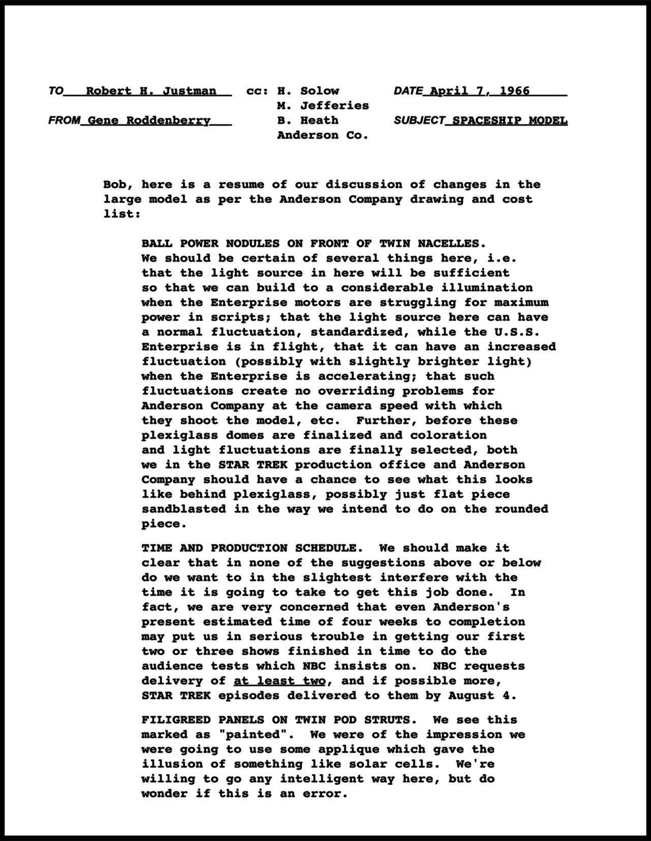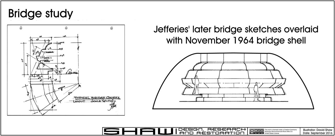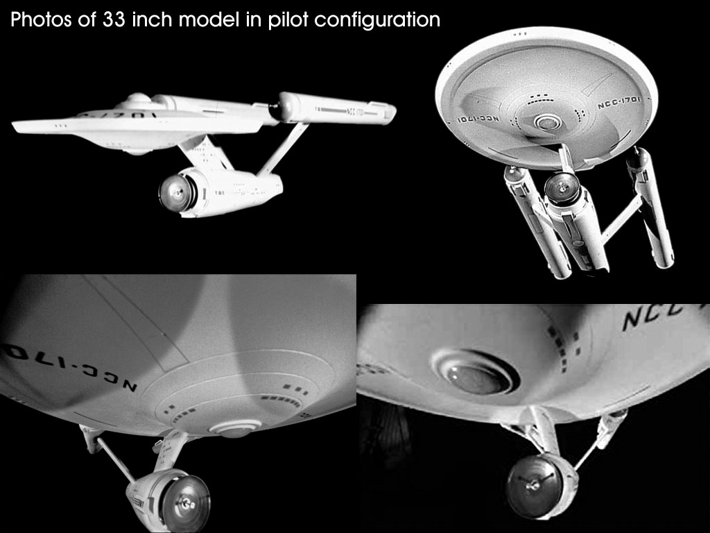 Shaw Posted December 5, 2023 Share Posted December 5, 2023 Introduction This is more or less a snapshot of my understanding of this subject, an understanding which is evolving with each day I spend researching this topic. This research started in ernest in 2007, but my passion for this model goes back to my first viewing of "Requiem for Methuselah". Throughout the 70's, 80's and 90's, all my models of the Enterprise were measured against the image of the 33 inch model on the table in Flint's lab (and they always fell short). While my main focus in this thread is on the 33 inch model of the Enterprise, the broader subject at hand is all of the models which represented the Enterprise on screen during the three seasons of the original Star Trek series. So there is a lot of extra information presented. Timeline of Events August 1964: A final overall configuration was picked, a color illustration was done and a study model was made by Matt Jefferies. The next few months would be spent working out the details of the ship under the supervision of Gene Roddenberry and Pato Guzman (the original art director for "The Cage"). Here are some of Jefferies' sketches during the intervening period and his accounting of events... "By the third time around he (Harvey Lynn) had two sheets of eight or ten drawings, plus a half dozen good-size renderings. One of them was the beginning of the design finally chosen and one that I liked very much... an upper, saucer-shaped hull, a cigar-shaped lower hull, and two engine pods. Before calling everyone in again, I did a little fast model building. I went down to the mill [woodworking shop], grabbed a couple of chunks of wood, and had the men turn out the saucer shape on a lathe. In about thirty-five to forty minutes I had a model. We hung it up on a piece of thread and called everyone in. Oddly enough, the original model was hung upside down as opposed to the way we use it now." "Based on that model and the color renderings I had prepared for it, Roddenberry felt we were on the right track. We wound up shortening the main pylon strut and made a few other little changes and then sat down to do some scale drawings." October 1964: Jefferies had started in on drawing a set of final plans of the Enterprise model. This model was based around a smaller bridge that Jefferies and Guzman saw as similar to the flight deck of a large aircraft or the control room of a nuclear submarine. When Guzman left the production, his supervisor at Desilu Studios, Franz Bachelin, took over as art director. Bachelin wanted the bridge to be more cinematic and requested that it include multiple levels. Here is how Jefferies put it... "The split-level bridge was not part of the original idea. I did not like it, and in many ways I do not now." In attempting to comply with Bachelin's request, Jefferies came up with these sketches attempting to shoehorn in this idea into the original size of the bridge structure. Bachelin wanted a more expansive bridge, and because the model's basic design had been approved and the studio was in talks with Howard A. Anderson Company about the pilot's effects, the most straight forward solution to the problem was to scale up the Enterprise to accommodate the final bridge design. Construction of the bridge set was started and Jefferies began drafting the final set of drawings of the Enterprise model. Nov. 4, 1964 (Wednesday): Richard Datin (via Howard A. Anderson Company) agrees to build an approximate three foot long model based on an early set of plans which give a real world scale of 1:192. If this had been the final drawings, this would have been the 540' version, but the proportions of this early drawing are actually different from the final plans. He also agrees to supervise the construction of the final (4x) large scale model (which would have most likely been 1:48 scale). Datin starts in on building the 33 inch model out of a kiln-dried sugar pine based on these early plans, which include notes on which parts of the plans he could use and which he shouldn't while waiting for the final plans. Datin has said that he contracted out the turning of the larger pieces to a local wood shop. Odds are that the primary hull of the 33 inch model was one of those pieces started before the final plans were finished. Nov. 7, 1964 (Saturday): The final construction plans are finished by Jefferies. These plans include the scale reference of FULL SIZE & 3" = 1'-0" TO LARGE MINIATURE. As the one feature linking the scale of the model to the live action sets is the bridge, the overall size was already determined by this point. In fact because Jefferies didn't want windows or the like on the surface of the ship, the bridge was the primary feature that would be used to sell the size of the ship to the audience in the pilot. This is a reconstruction of the plans given to Datin of the Enterprise... Nov. 8, 1964 (Sunday): Datin receives the final plans.. This date needs to be double checked. The drawings are labeled November 7th and I'm assuming he got the drawings within 24 hours of their completion. Datin's time sheet shows him working continuously on the model starting on the 7th. Nov. 15, 1964 (Sunday): A little more than a week later the 33 inch model is presented to Roddenberry for approval. This is where the request for the addition of exterior windows takes place (which were not part of the original design). The windows seen on the few elements of the original drawings were added after the original completion date of those drawings. My understanding is that Roddenberry was constantly asking Jefferies for more details. Nov. 16 & 17, 1964: Datin noted his work on the 4x Enterprise on these days, which was most likely him making arrangements with Volmer Jensen's Production Models Shop in Burbank about its construction. This is also most likely the time in which Jefferies modifies the plans to include windows for Datin to add to the model (and why Datin didn't start in on the w