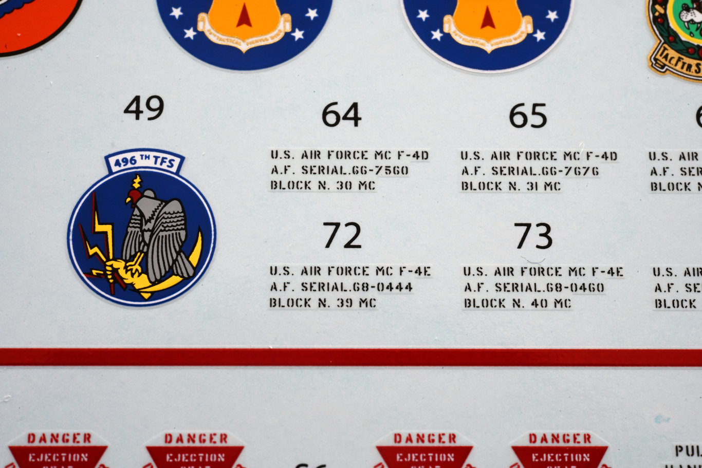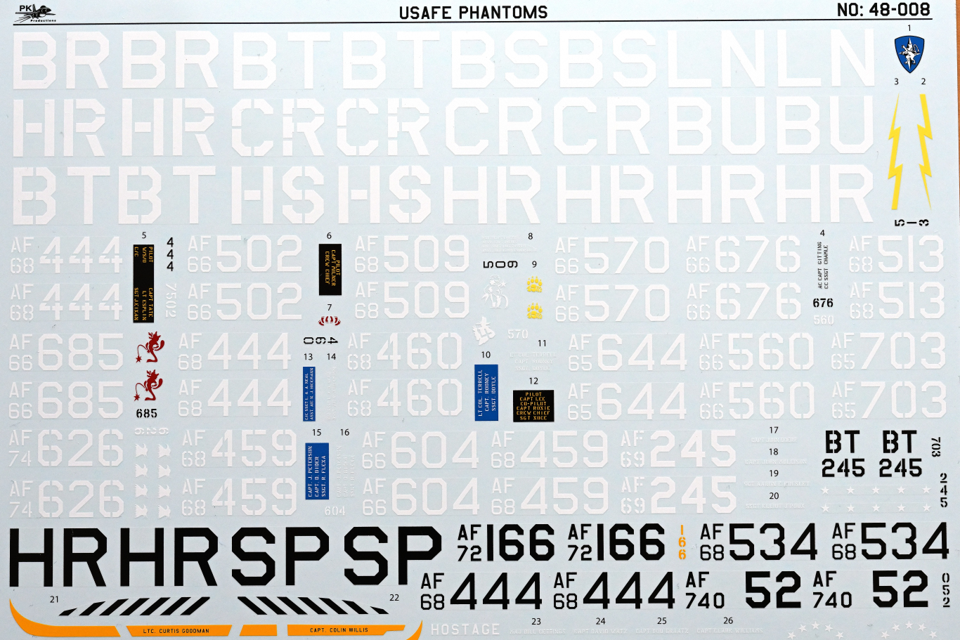 falcon91352 Posted April 28, 2024 Share Posted April 28, 2024 Hello Yesterday, I picked up the newest aftermarket decals 48-008 USAFE F-4Ds and -Es from PK Prioductions and it is a very nice set! All in all options for 22 USAFE Phantoms are included, the most are depicting markings from the 70´s. Eight F-4D and ten F-4E from this period are represented, as well as four F-4E from the early 80´s, one of the 52nd TFW options is camouflaged in the SEA wrap arround scheme with a short lived NATASCHA lettering on the left intake. Quote Link to post Share on other sites