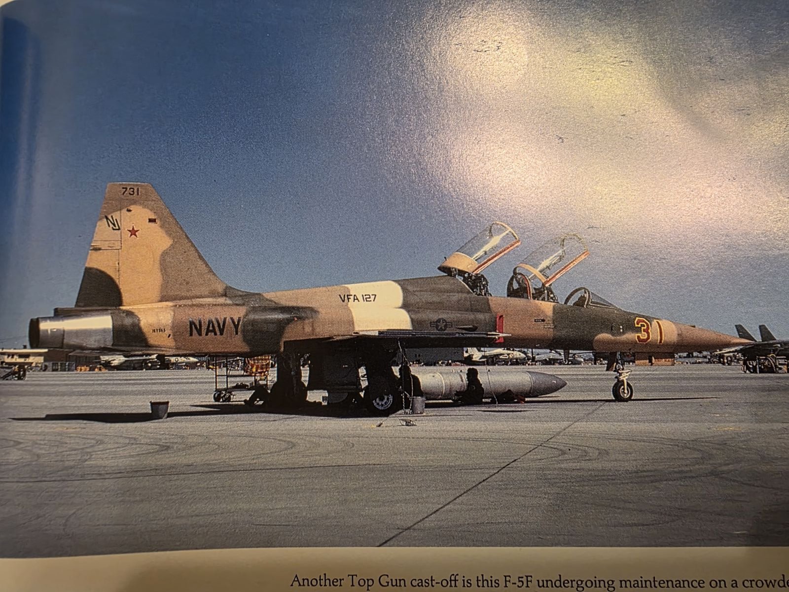 f5guy Posted October 29 Author Share Posted October 29 Thanks for the kind comments guys! Now regarding the F-5F..... Does anyone have good pics of the upper and lower surfaces of this jet in its later Topgun or VFA-127 years? I've found a few pics from Dave Baranek online, who was a Topgun pilot and took a lot of pics, but they're not quite what I need, although they are a lot of help. The reason I ask is that I have Furball Decals sheet 48-056 "Topgun Tigers & Talons" (highly recommended by the way), which has the paint scheme for this jet. However, comparing it to later pics shows that while the side views are generally the same, the upper and lower patterns are way off. Now I'm not saying that they got it wrong though, as they depicted the jet in 1981, before it went through depot level overhaul. It appears that it was repainted into largely the same scheme, but the upper and lower wing patterns were very different. This is one of the few pics that I have to work with. I think that I've got enough to work with, but if anyone has anything that they can share, that'd be great. Thanks, Fred. Quote Link to post Share on other sites