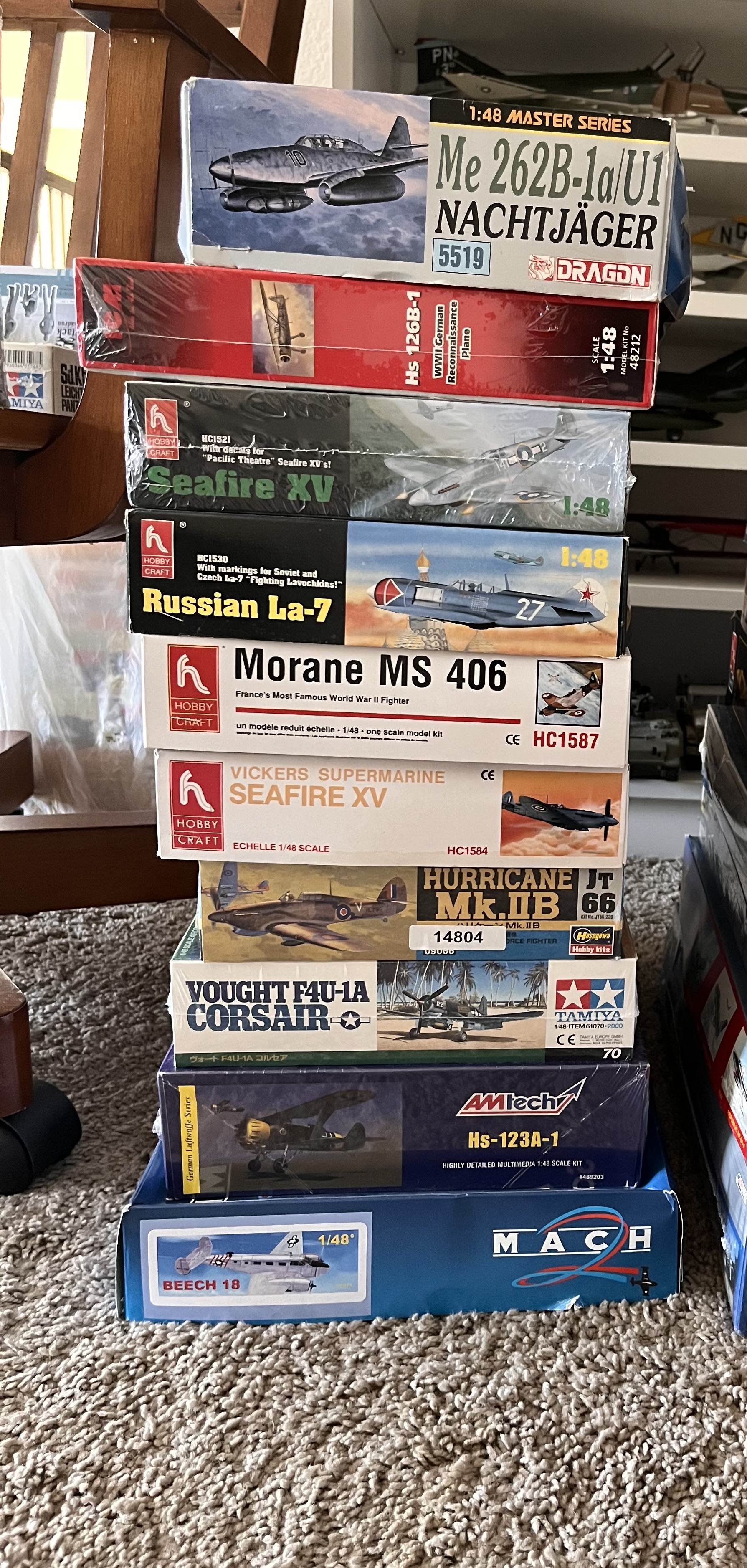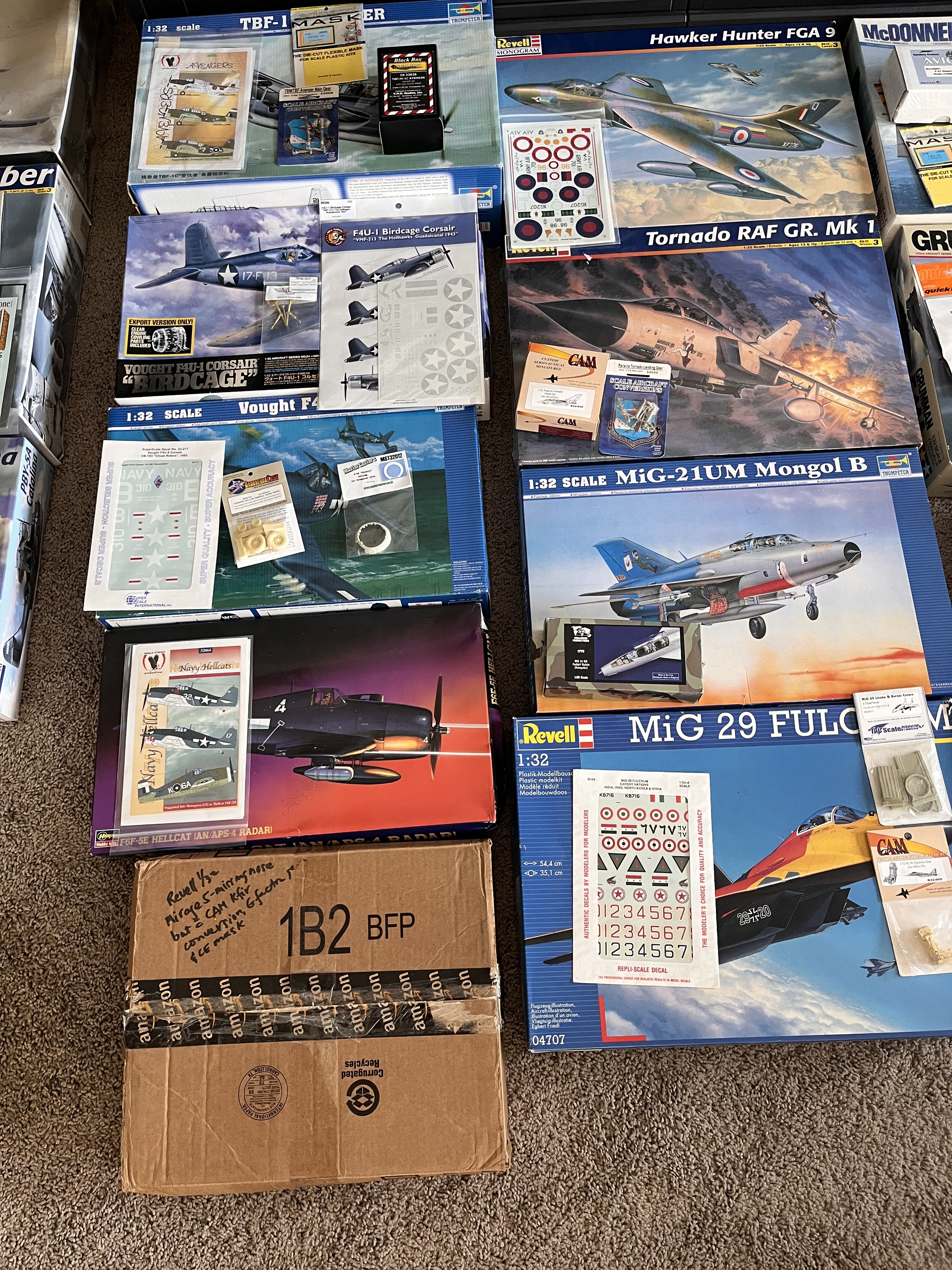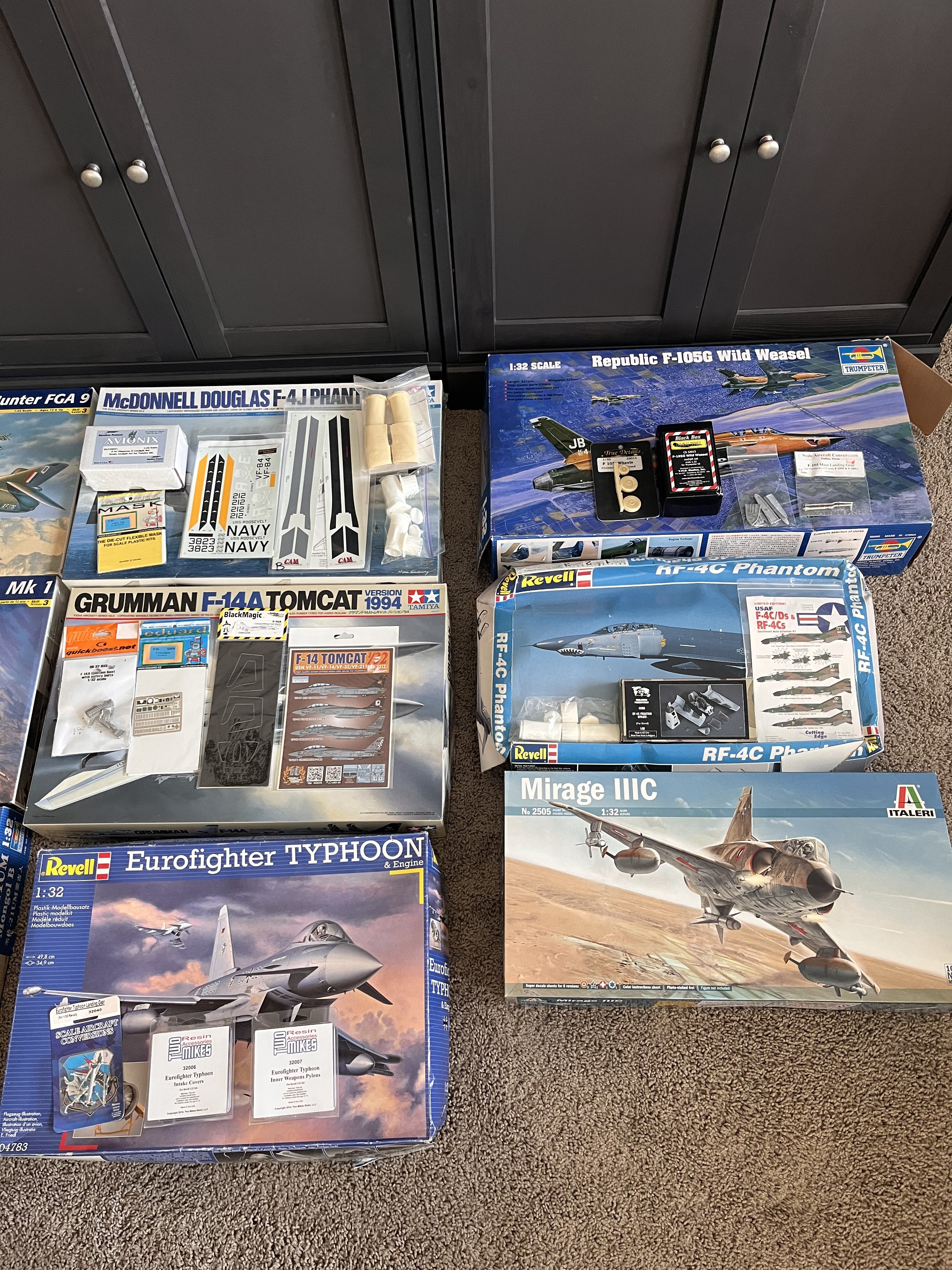 dann Posted September 9, 2025 Share Posted September 9, 2025 1/35 Dml 6333 $19 6377 $19 6409 $13 6455 $13 6477 $13 6519 $14 6514 $15 6010 $11 6054 $11 6144 $11 6145 $11 6161. $11 Tamiya sdkfz 223 $20 1/32 RoG Fw190 D9 late with eduard mask $55 RoG Do-27 $25 Hasegawa P-47D with eduard mask $80 Hobby boss F-84E sealed with eduard mask $60 Trumpeter A-4F $75 Trumpeter Mig 21PF $55 Trumpeter Mig 15 $26 Hobbycraft Mig17 $26 Hasegawa hellcat with aftermarket decal $45 Trumpeter F-105G with AM LG, intake covers, BB cockpit, wheels $160 Trumpeter MiG 21UM with verlinden update set $90 Trumpeter TBM avenger with AM decal and BB cockpit , mask and SAC LG $175 RoG Eurofighter with two mikes inner weapon pylon, two mikes intake cover and AM landing gear set $110 Revell RF-4C with AM decal, AM exhaust, verlinden update set $155 Revell Tornado GR1 with Cam cockpit , SAC LG $ 90 Revell Hunter with AM decal $75 Tamiya Birdcage Corsair with AM landing gear and decal $150 Trumpeter A-10 with AM decal , vac form canopy and mask $115 Tamiya F-4J with eduard mask, decals, exhaust, seamless sucker intakes , avionics cokpit $180 Tamiya F-14A 1994 with AM decal, AM seats, AM interior set, AM mask $190 Revell MiG 29 with AM intake and exhaust cover, AM seat, AM decal $70 trumpeter F4U-4 with aftermarket stuff $85 Pro Mod He-111 sealed with AM cockpit instrument decal $140 Revell Mirage V with CAM Kfir conversion, CE mask, G factor LG $120 1/35 Trumpeter Mi-4 $85 DML MD 520G $80 Panda Tunguska sealed $35 Italeri PT boat with Italeri PR 109 crew figures $160 Seminar UH-1B sealed $35 1/24 Hobbycraft spitfire missing figures $69 1/25 police cars $15 each 1/48 Datsun $17 1/48 Trumpeter Seahawk sealed $32 Hasegawa RF-4E JASDF $40 Hasegawa phantom FGR Mk2 sealed $42 Hasegawa A-7E with partial superscale desert storm marking $39 Hasegawa AH-64D $36 AA F-8II sealed $25 FM F-11F $180 AMK MiG 31 with furball design canopy seal $75 Trumpeter Mig 23ML $38 Academy T-50 sealed $29 Special hobby Buckeye $45 Kinetic Hawkeye sealed $74 Fujimi F-1 $13 ESCI Mirage V $14 KP Şu-25U with canopy mask $29 Heller mirage III $15 Hobbycraft F-94B $15 1/50 Heller aerospatiale $30 Pro Mod A-4F sealed fightertown decal $55 Hasegawa F-22 with galaxy model mask and cross delta exhaust sheet $85 Revell B-1B sealed with AM decal , AM update set (2) , eduard PE, CE mask $220 Airfix Merlin with AM canopy mask $200 1/48 Hasegawa Me 109 trop sealed $17 Hasegawa Hurricane II $20 Hobbycraft Seafire sealed $14 Hobbycraft Morane MS406 sealed $19 Tamiya Me 262 sealed $35 ICM Hs 126 sealed with canopy mask $39 Tamiya F4U-1A sealed $24 Mach Beech 18 $39 AMT Hs 123 $25 Tamiya swordfish $ 100 PE set Decal set Monogram Catalina with AM LG, AM decal , eduard mask $125 Monogram B-29 sealed with SSD Enola Gay decal $90 Plus shipping 77407 PayPal, MO, Venmo Quote Link to post Share on other sites