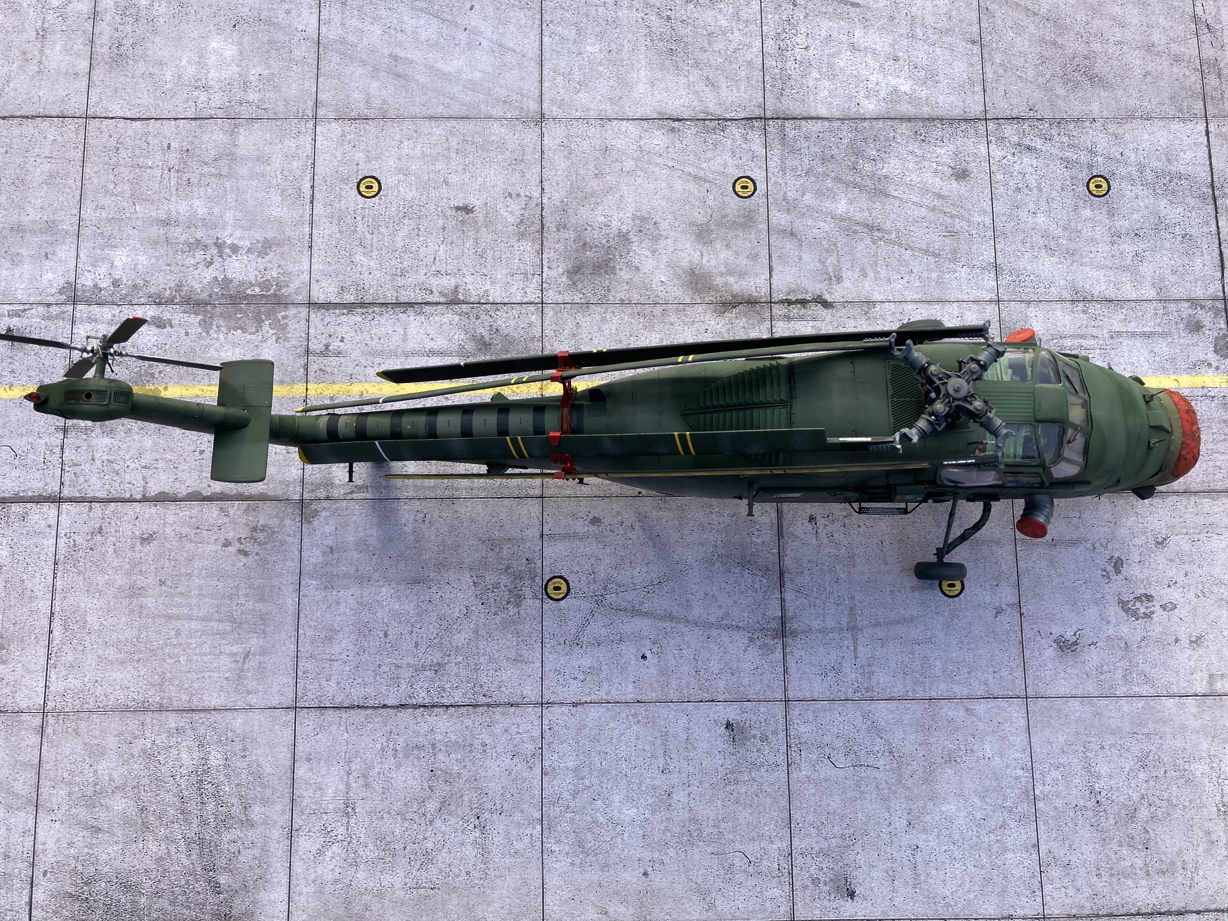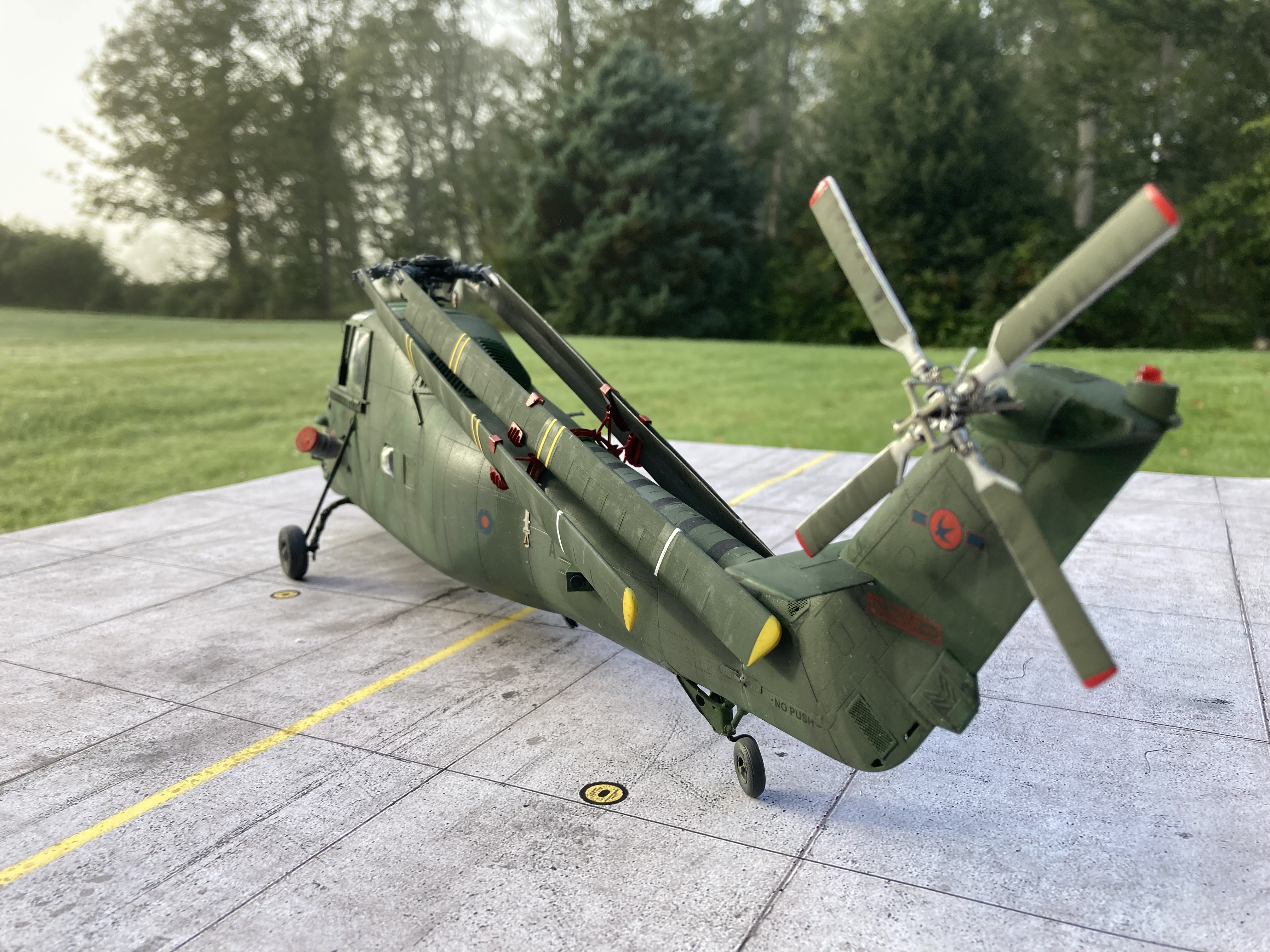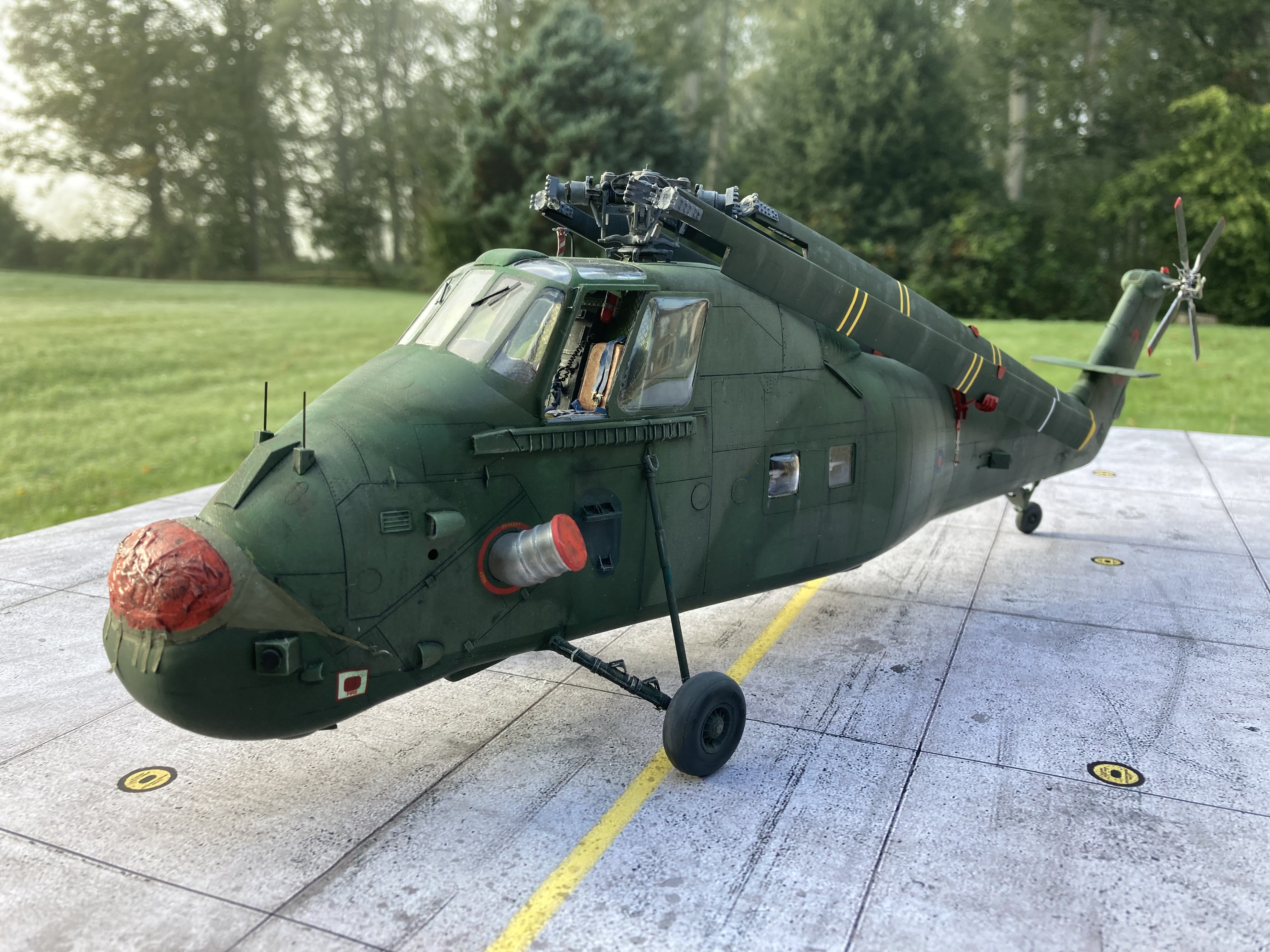 Porsche Posted October 14, 2025 Share Posted October 14, 2025 I bought this kit a Fly:1/32 Wessex (32010) in September 2022 and from the opening of the box and checking the content I should have realised the kit was going to be a problem. On inspection of the parts I discovered lots of the resin parts were broken (actually destroyed) and some parts missing. I contacted the retailer who in turn contacted Fly for replacements which duly arrived in couple of weeks. So on with the build….I spent a very long time detailing the interior which, unfortunately led me down the proverbial rabbit hole, so much so in fact that I put the kit back on the shelf of doom where it remained for three years! I picked it up again with the intention of making some space in my emporium. I stuck it together and to be fair, it didn’t go together too badly. I replaced most of the resin parts with brass and plastic rods etc. I then came to the point of attaching the windshield transparency which was somewhat challenging. I was pleased to get the construction done (well, apart for the rotor fold…more of which later) and I got the thing primed ready for painting. I chose the 2 tone green camouflage version and proceeded to paint the said colours. Looking at the detail I’d fixed onto the airframe I decided to paint the camouflage free hand which was the easier option in my opinion giving my ability to pull things to pieces when attaching/detaching masking tape! I’d bought the scale warship rotor fold set at the same time I bought the kit (having previously used their rotor fold on a Lynx) I found that assembling this straightforward but when it came to attaching the rotor blades to it I needed several hands! I think I’ve positioned the blades too close to the fuselage but they’re staying where they are now for the time being…I may well re-visit in a 4 years time? The kit is now finished (?) and is resting in the cabinet. I apologise to all the Wessex experts if I’ve made any glaring mistakes and/or inaccuracies! I have scant knowledge of the type but to me, it looks like a Wessex and, more importantly it’s freed up some space. The kit was painted with Tamiya XF67 and Revell 67 (?) And weathered with pastels. Well done if you’ve managed to get to the end of this long intro and so on with the photos… Kevin Quote Link to post Share on other sites